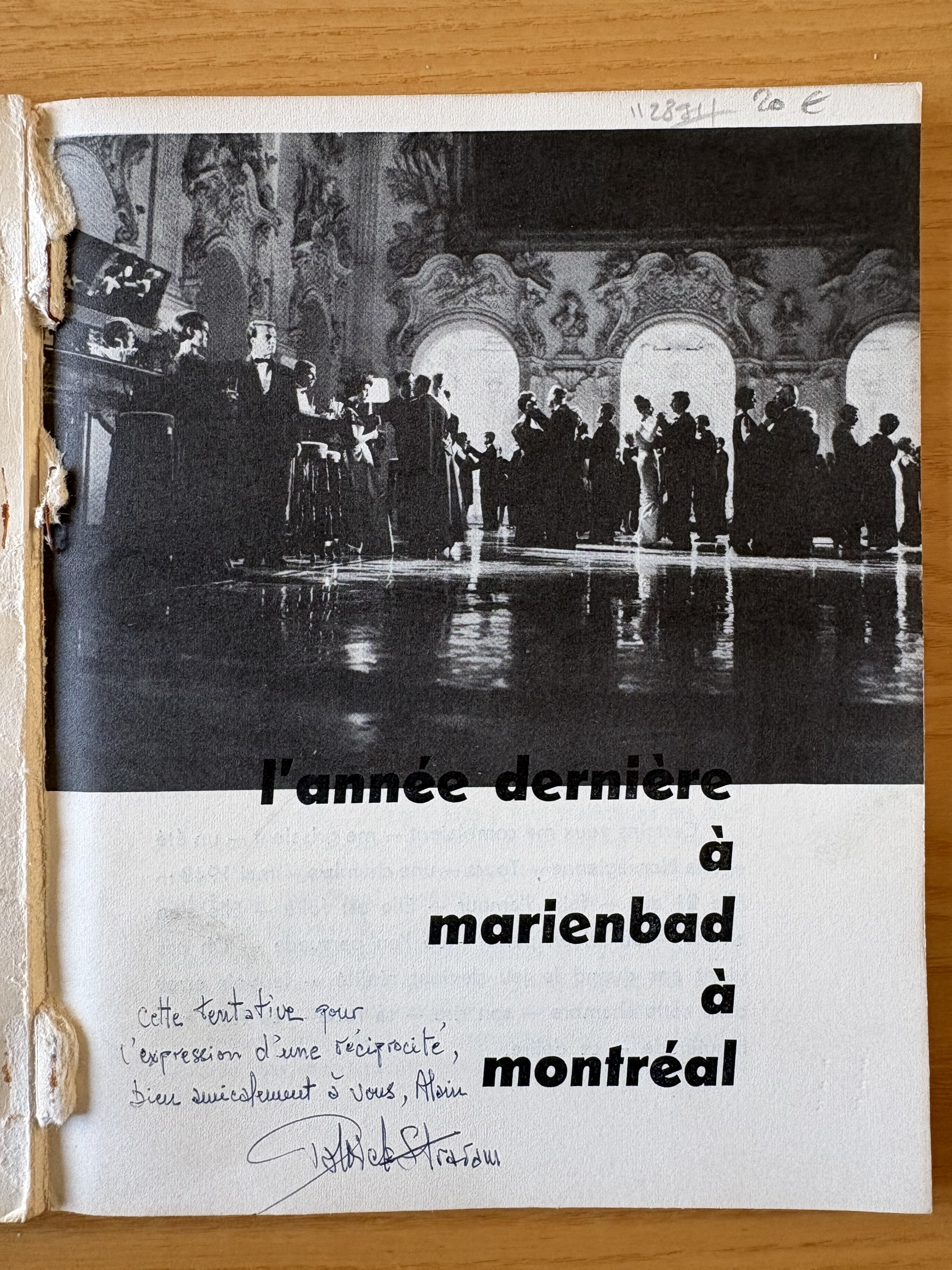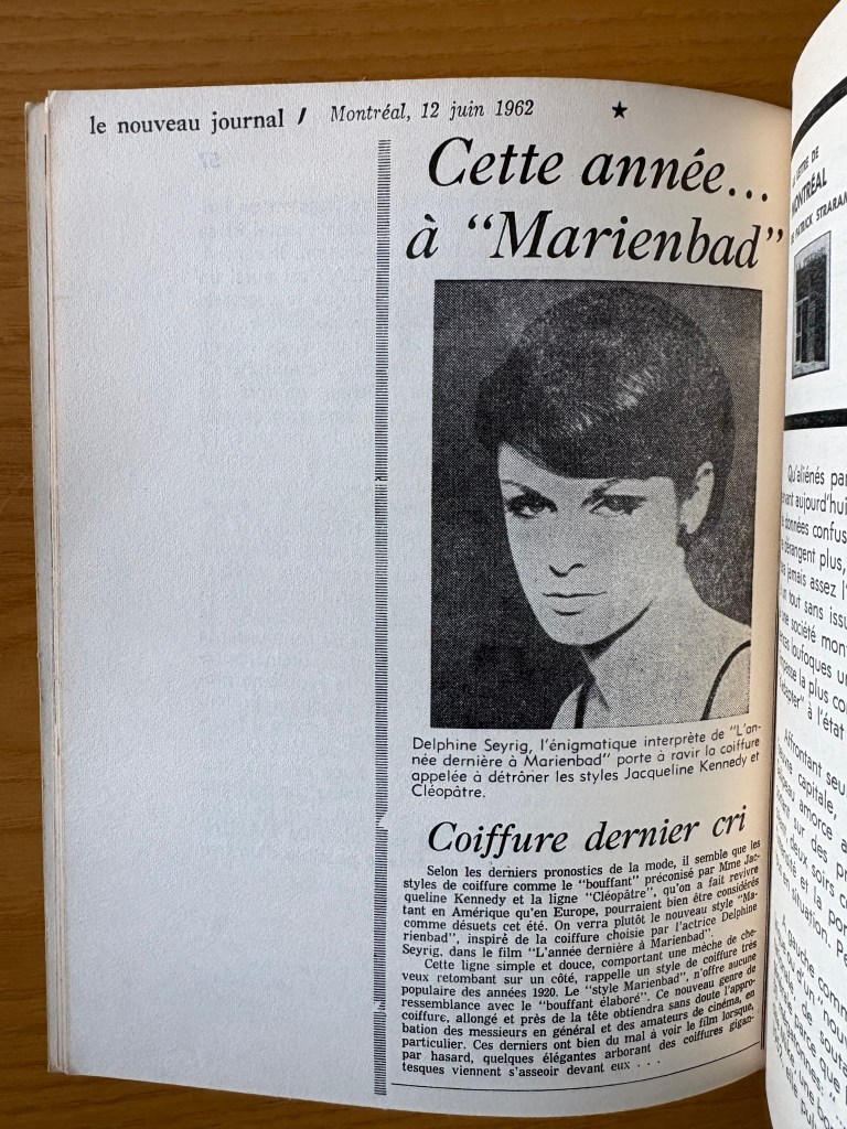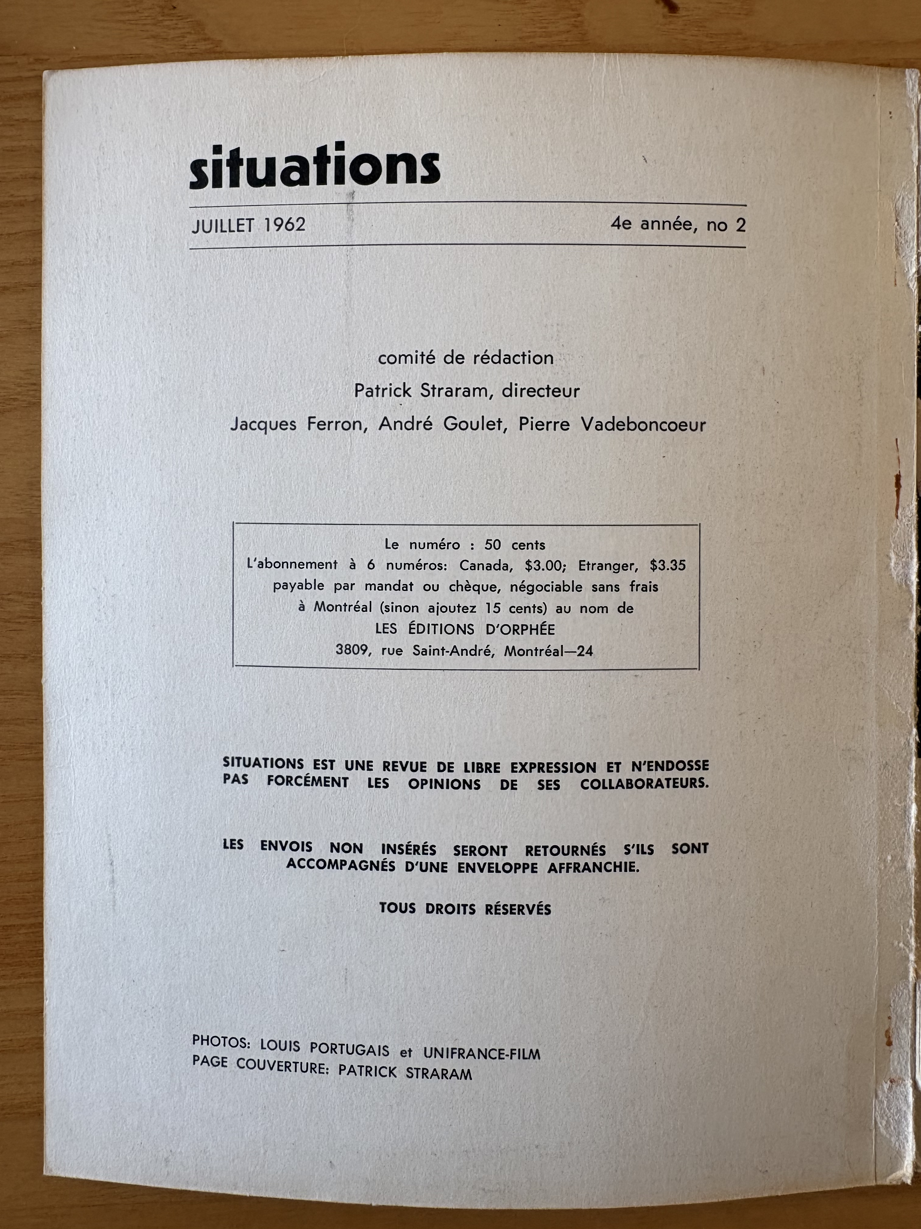 STRARAM, Patrick. “L’Année dernière à Marienbad à Montréal” (in Situations Vol. 4, no.2). Montreal: Situations, July 1962. 68 p. [but only pp. 41-68 present]; ill.; 16 x 20 cm.; ill. Cover with collage by Patrick Straram. Very good; pages 1-40 have been torn out by Straram so that Alain Resnais would only receive the relevant section of the periodical