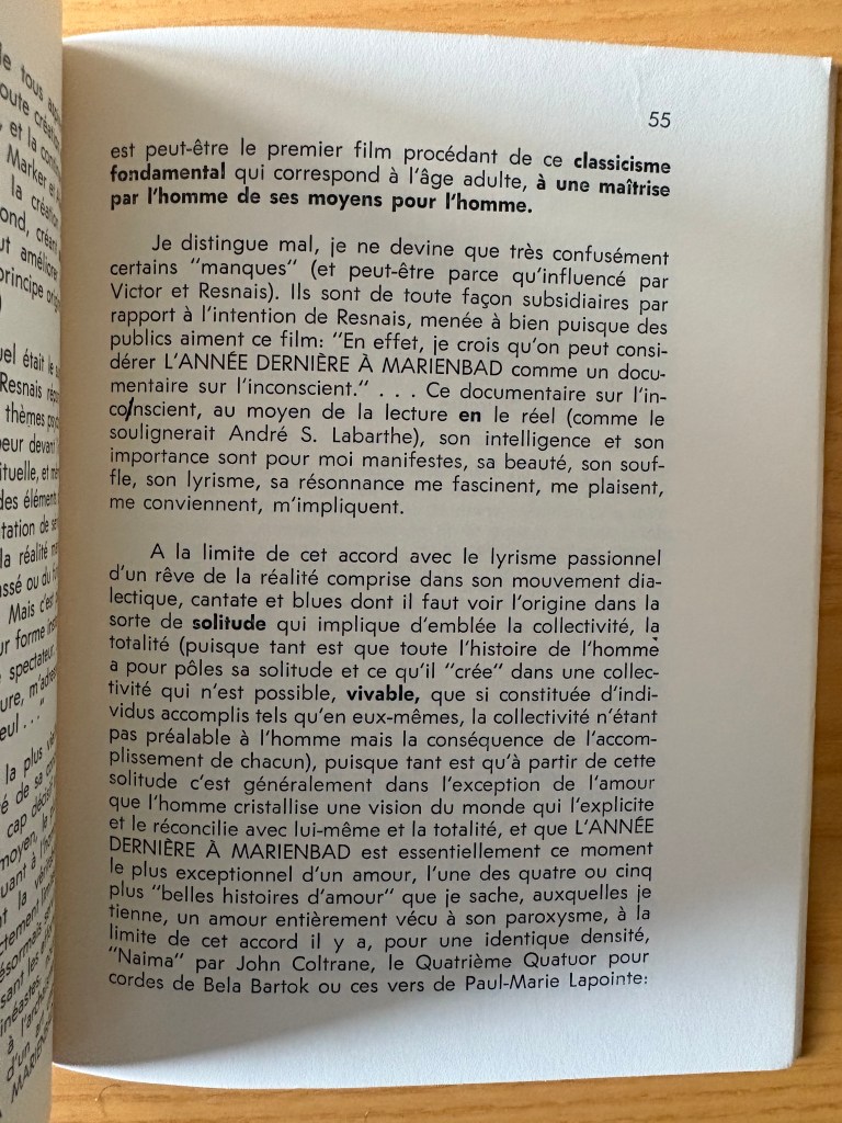 “Sérénité délirante d’une tentative tentation” (p.50-57), an elegy of Alain Resnais’ “L’Année dernière à Marienbad“, released in 1961