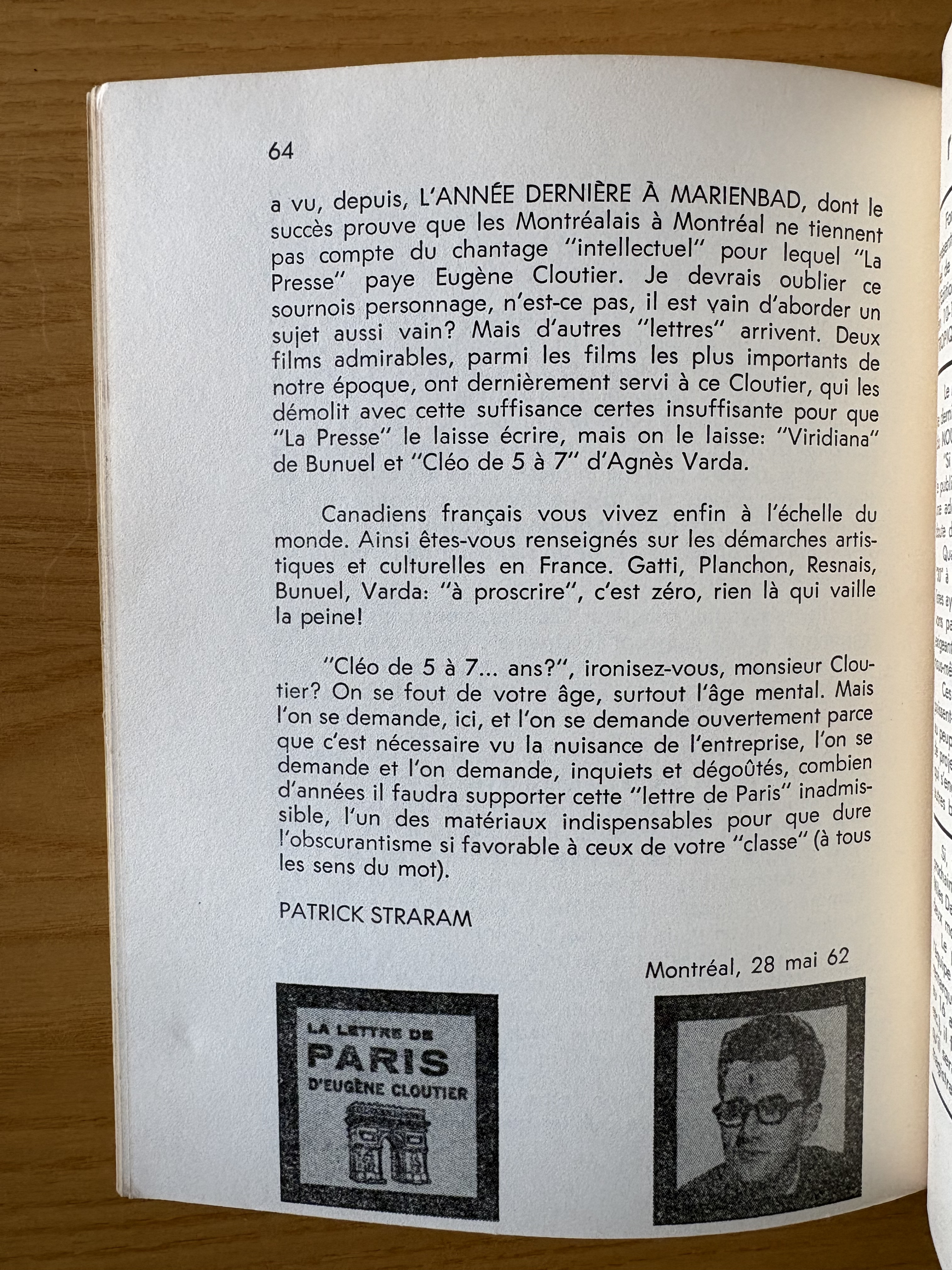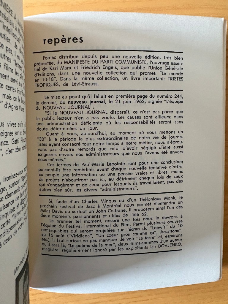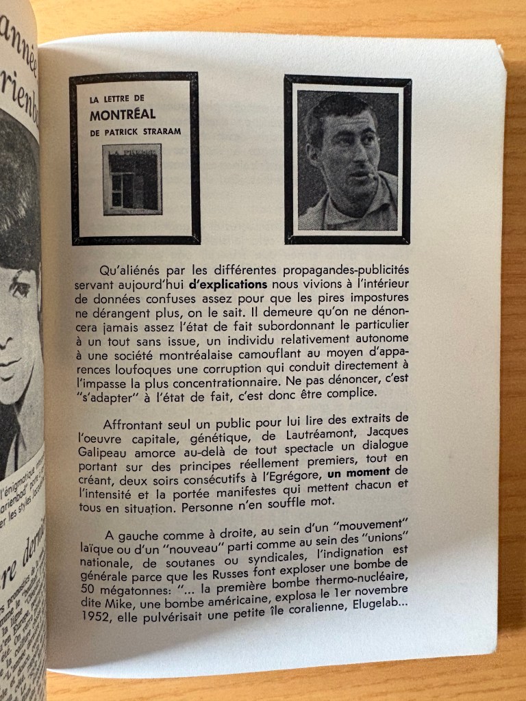 “Lettre de Montreal” (p.58-64), Staram’s take on the climate in Quebec and around the world in 1962