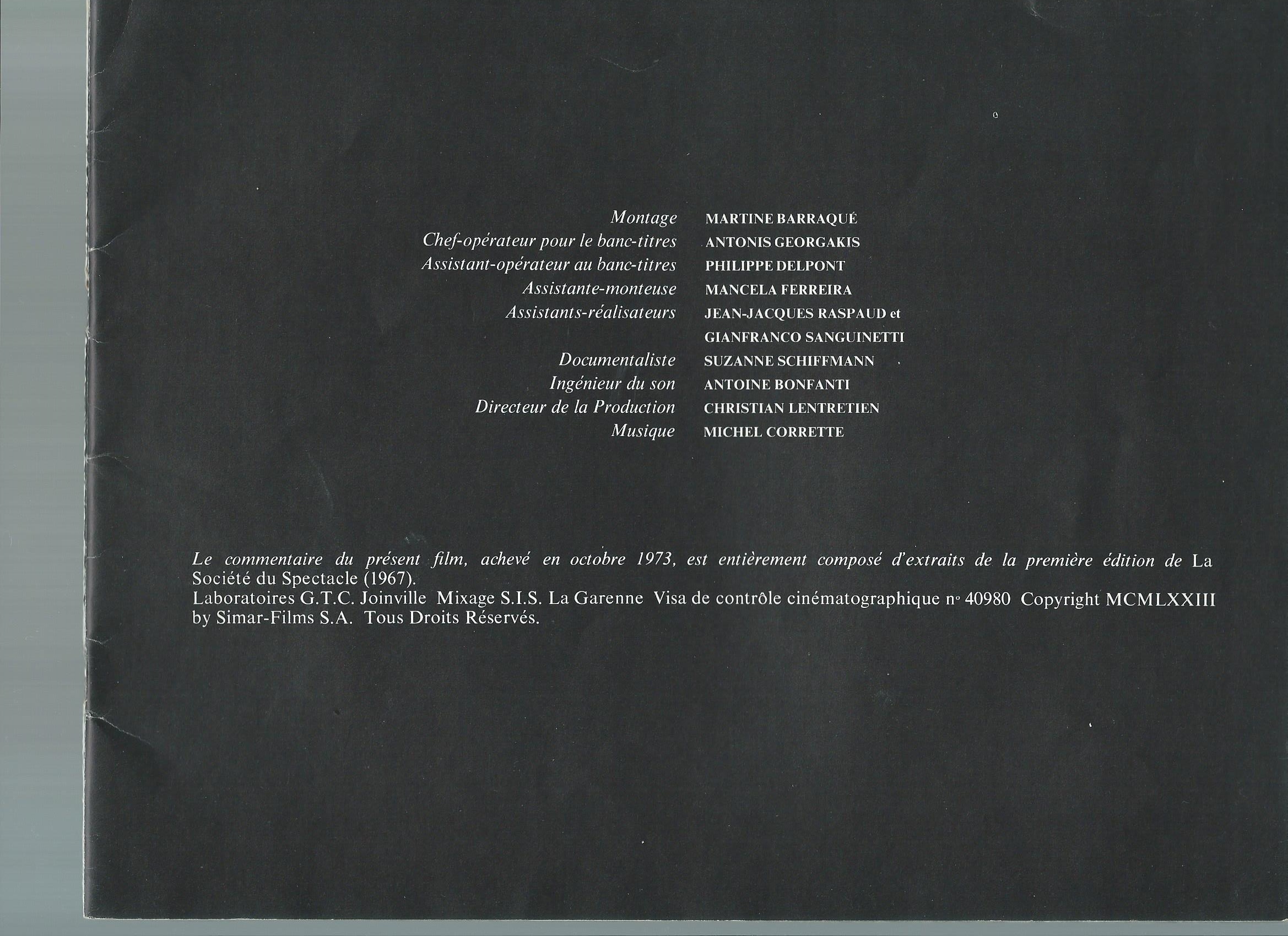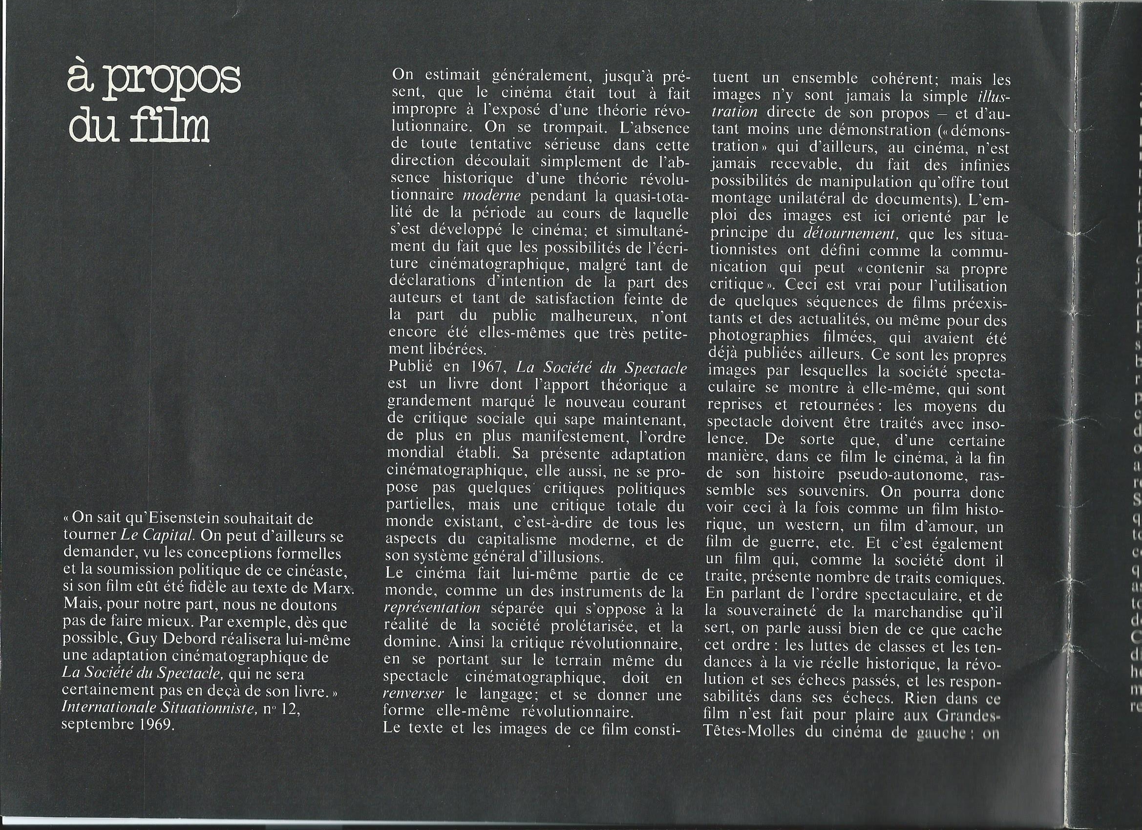Just as some potential extra info – this document is available in facsimilie (fairly loose though – the typography isn’t reproduced properly) in the official box-set release of Guy Debord’s movies.