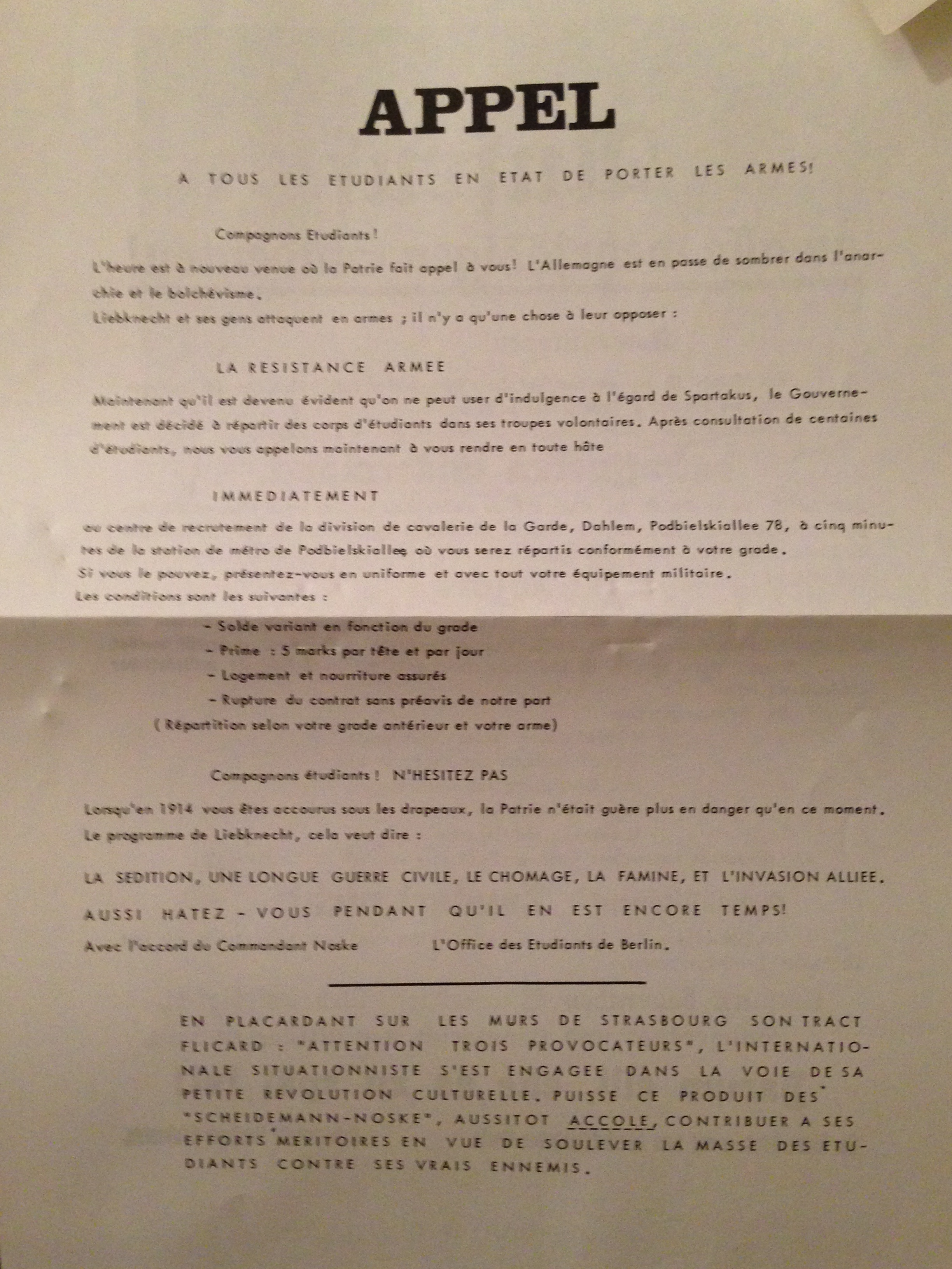 4) A photocopy of the supplement to Internationale Situationniste entitled “Attention ! Trois provocateurs”, dated 22 January 1967 and signed by Bernstein, Debord, Khayati, J.-V. Martin, Nicholson-Smith, Raoul Vaneigem, Vienet. Stapled to it is Frey, Garnault and Holl’s response, “Appel à tous les étudiants en état de porter les armes !, produit des « Scheidemann-Noske”, fictitiously signed by the Office des Etudiants de Berlin. Includes original text in German and translation in French