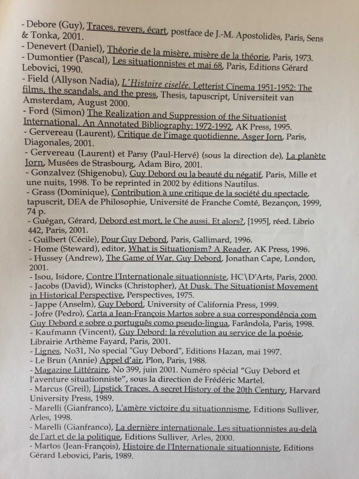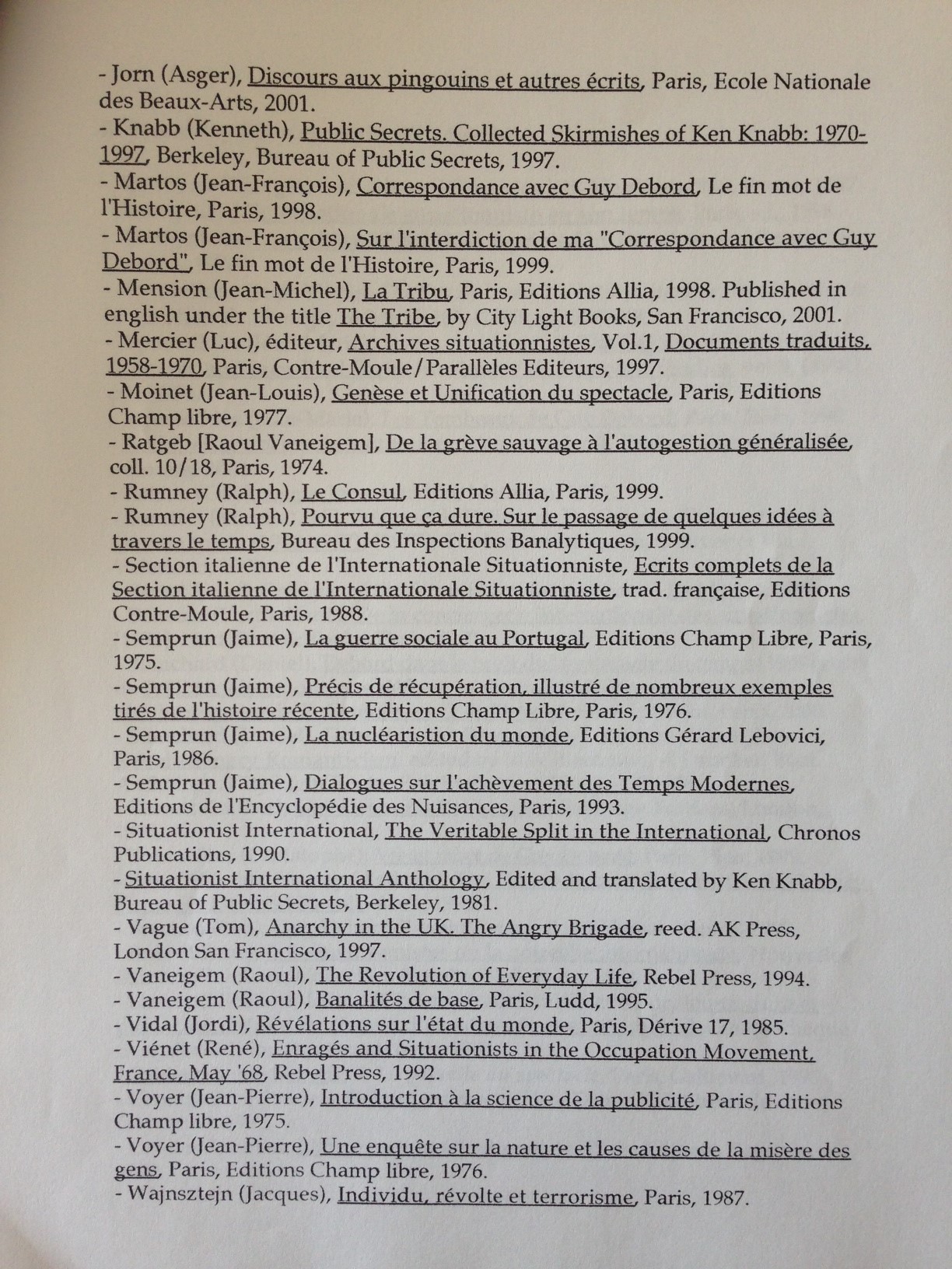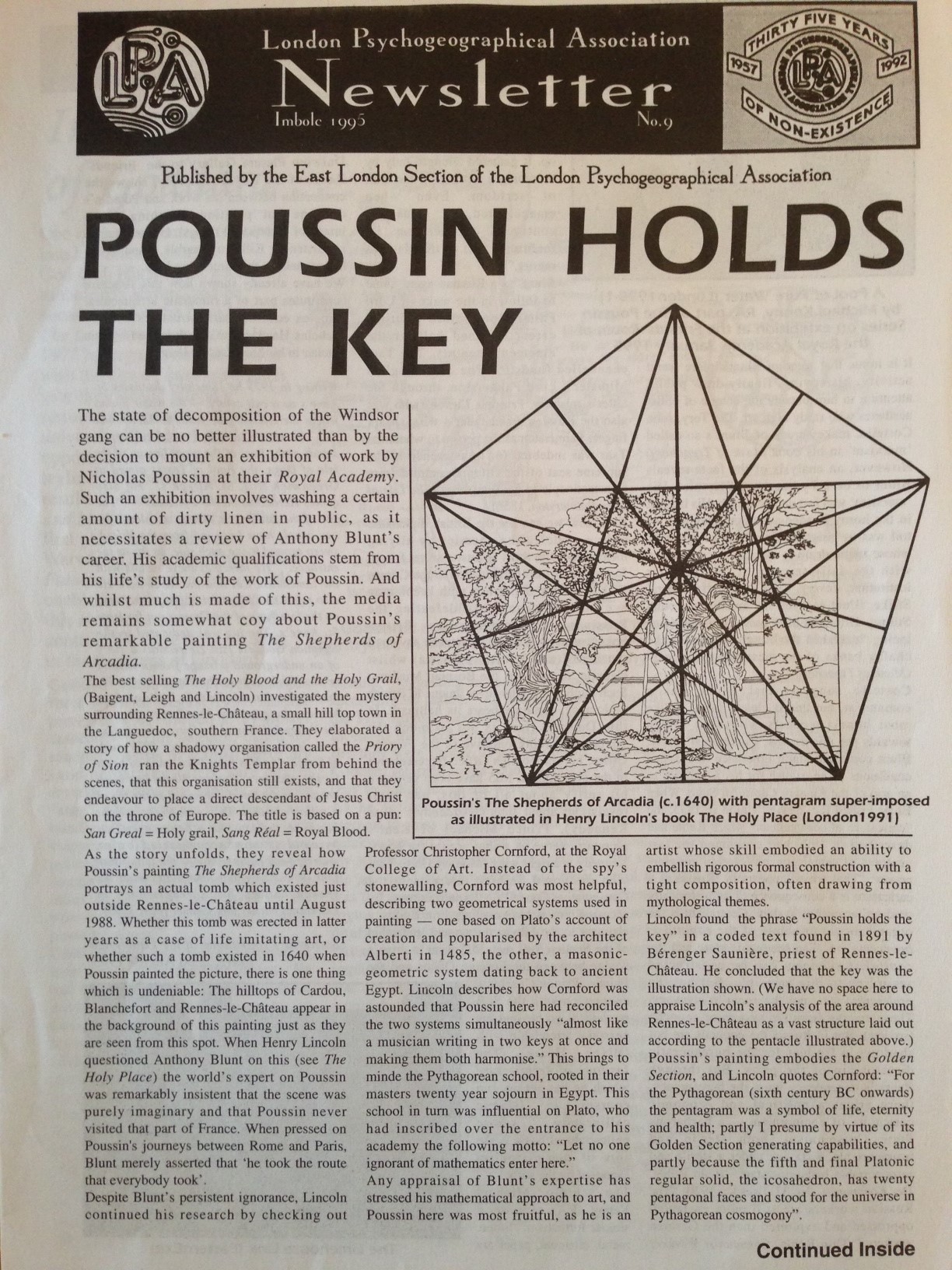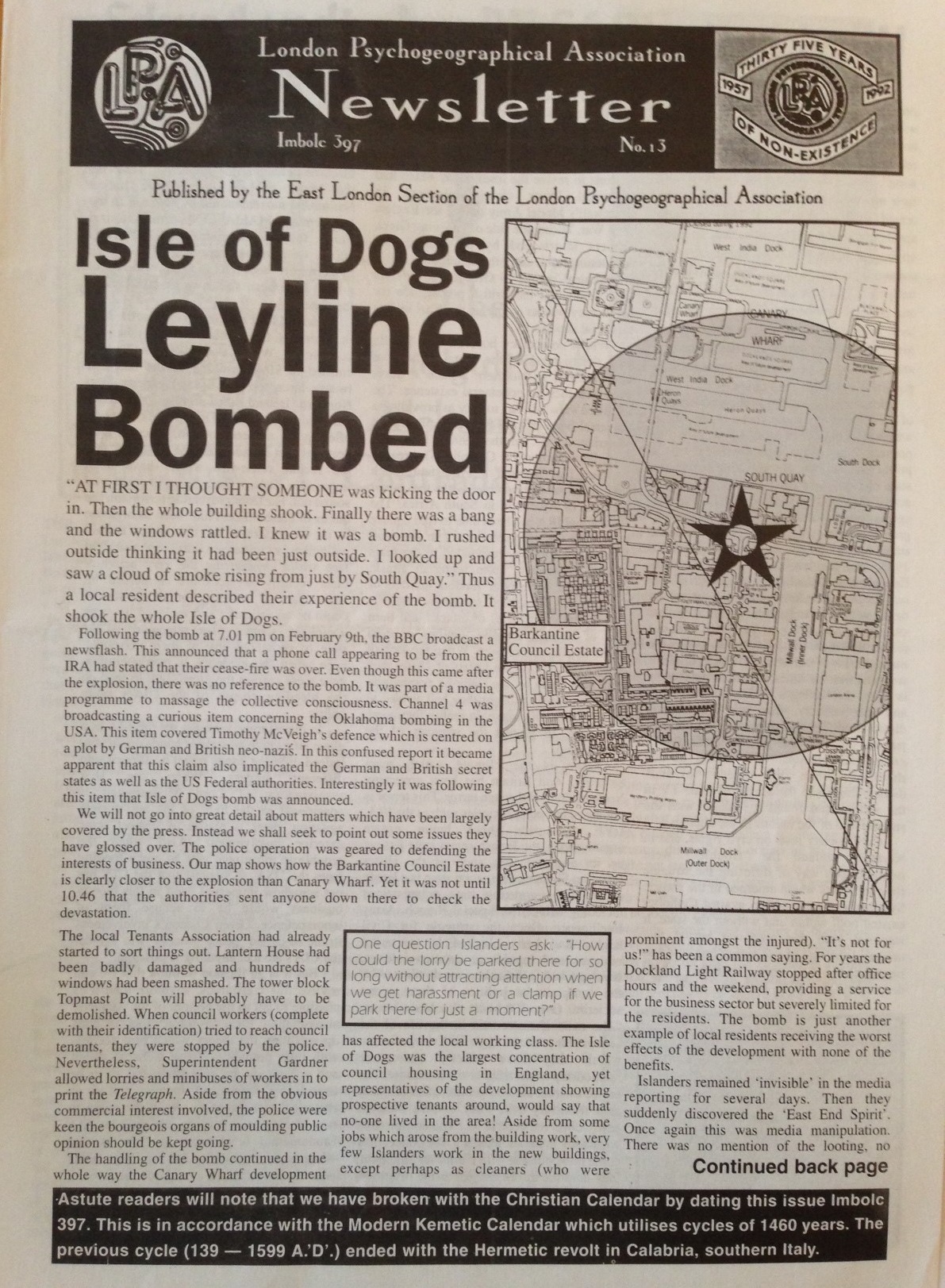 The London Psychogeographical Association (LPA) was originally founded by Ralph Rumney in 1957, but never disbanded. In the 1990s, Fabian Tompsett (under the pseudonym of Richard Essex), resurrected the long-dormant group as the LPA East London Section. Like Transgressions and the Manchester Psychogeographical Association – which were also active around the same time – the LPA rejected the orthodox Situationist vision of psychogeography, engaging instead in “Magico-marxism” and similar approaches. Beyond its publications, the LPA sponsored psychogeographical trips, which were advertised in its newsletter. Although it has been inactive since 2000, the LPA maintains a website at http://www.unpopular.demon.co.uk/lpa/organisations/lpa.html. A few issues from the newsletter can be found there.