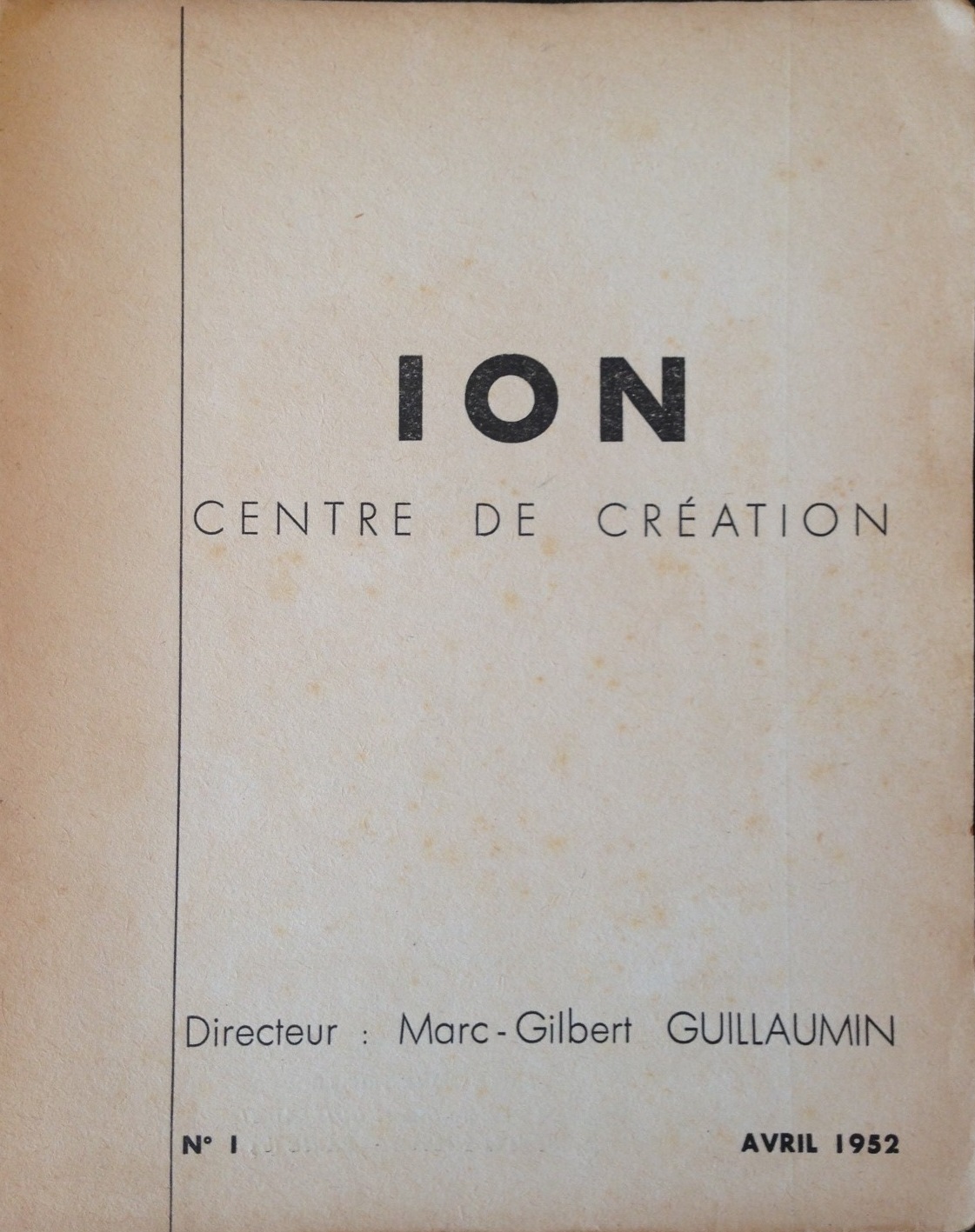 Guillaumain, Marc-Gilbert [aka, Marc’O] (Ed.). Ion: Centre de Creation no.1. Paris: n.p., April 1952. 286 p.; ill.; 22 x 17.5 cm.; green cover with text in white (back cover is a metagraphy by Gabriel Pomerand).