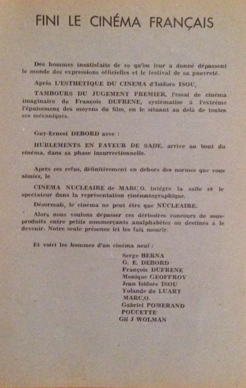 Issued by the Groupe Lettriste (the Internationale Lettriste was only founded in June 1952), this double-sided leaflet was distributed at the 5th edition of the Festival de Cannes, held from April 23 to May 10, 1952. It promotes Lettrist experimental films, some of which had been banned by censorship, and announces the end of cinema in France. It is worth noting that Lettrist attempted to derail the Festival de Cannes by interrupting official movie screenings, getting involved in brawals, and vandalizing movie posters (e.g., by covering with them with the words “cinema is dead”).