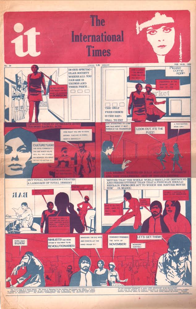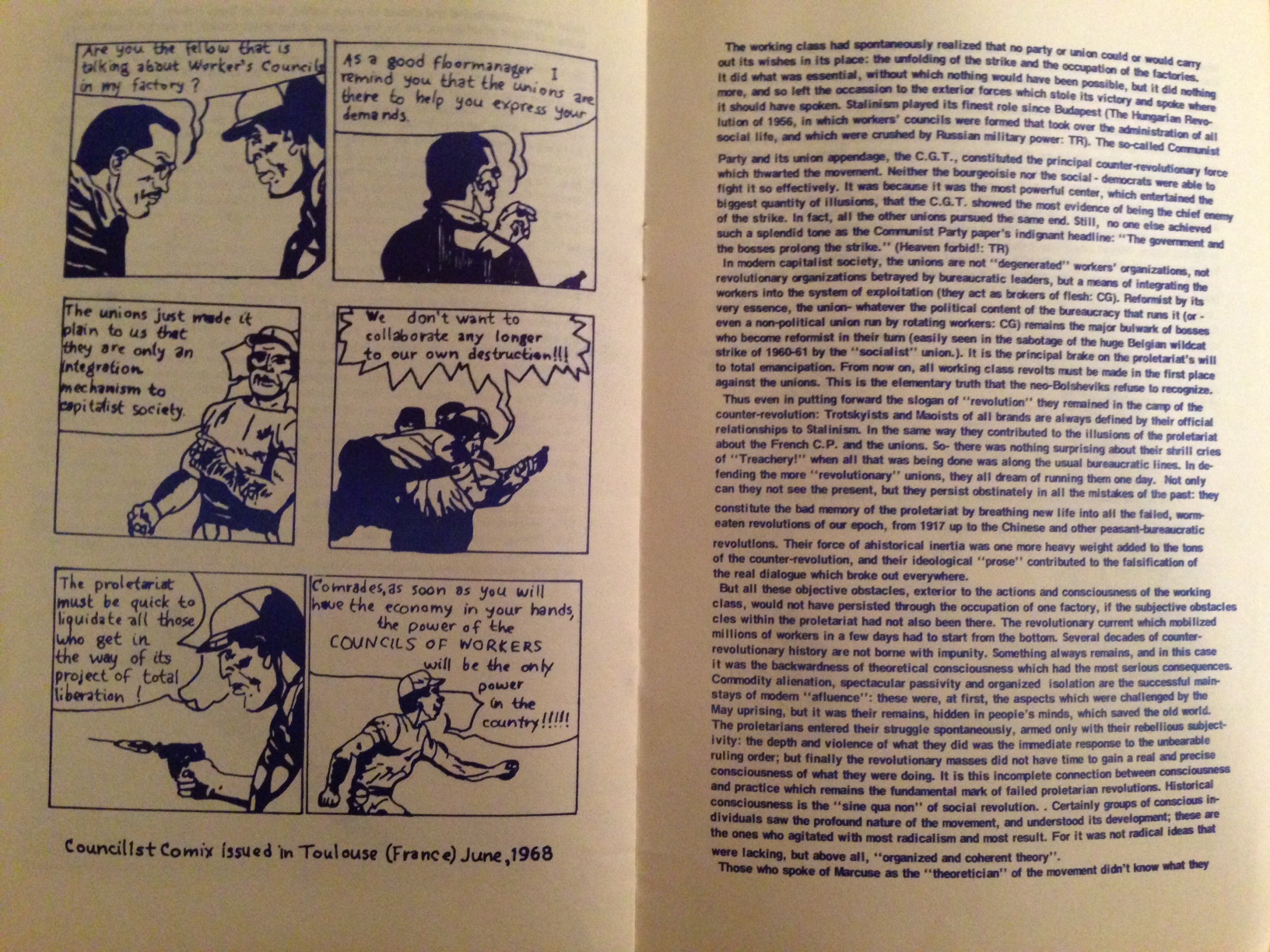 Yet another librarian’s nightmare, with little information on anything but authorship. This is Christopher Gray’s translation of a portion of Rene Vienet’s Enrages et Situationnistes dans le Mouvement des Occupations(Paris: Gallimard, 1968), enriched with illustrations (see below). Gray, who was briefly a member of the SI, is known as the author of Leaving the 20th Century: The Incomplete Works of the Situationist International (London, UK: Free Fall Press, 1974), the first English language anthology of Situationist texts