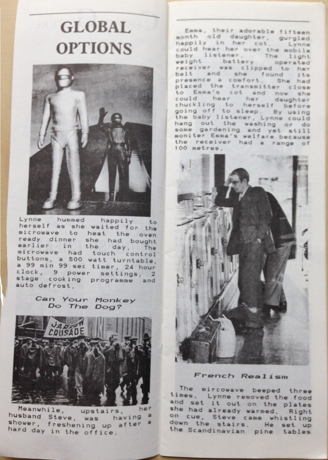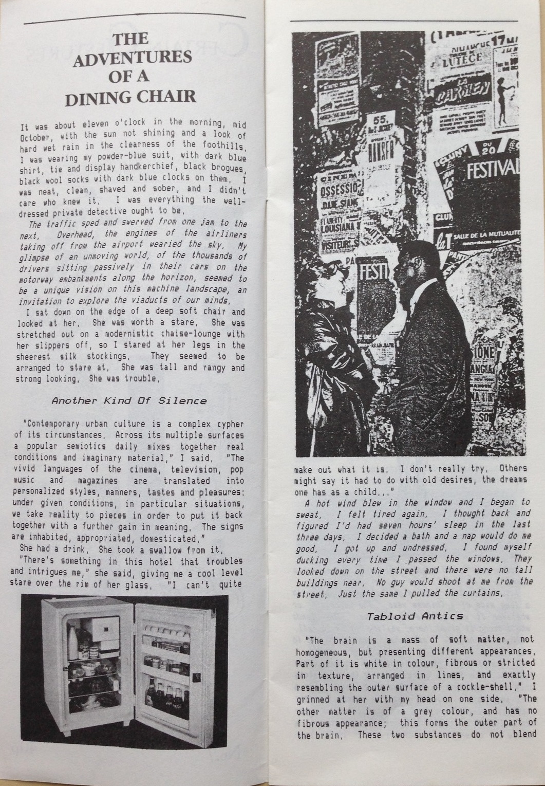 This issue of the pro-situationist zine contains two pieces. “Global Options” is a matter-of-fact description of a typical middle-class evening at home, with an emphasis on the objects (microwave, television, etc.) that the bourgeois couple and their child derive pleasure from. “The Adventures of a Dining Chair” (no doubt a nod to “The Adventures of Dialectic”) is an attempt to both mimic and pastiche Situationist detournement by mixing detective-novel writings with Situ-inspired political commentary.