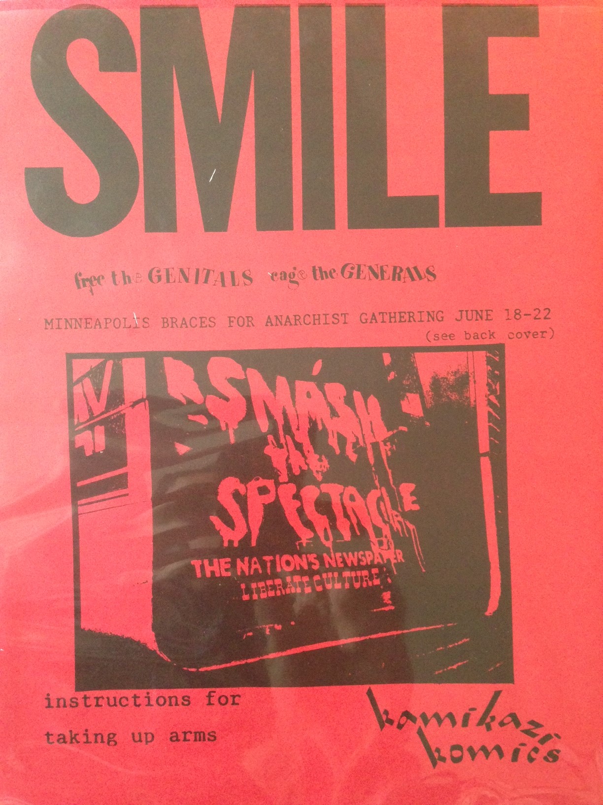 This series of SMILE is by Schiz-Flux, out of Madiscon (WI). It tackles a variety of topics, but the Situationist influence is strong. Issue #2 is essentially devoted to the SI, and contains “Socialism or Barbarism”; “The Totality for Kids”; “Festival of the Swamps”; “Situationist matter”; “Bolshevism matter” and other such articles.There were seven issues published, with the last issue released in 1993 (SQUIRTS: A Children’s Journal of Flows). We hold issues 1-6, but are missing issue 7.
