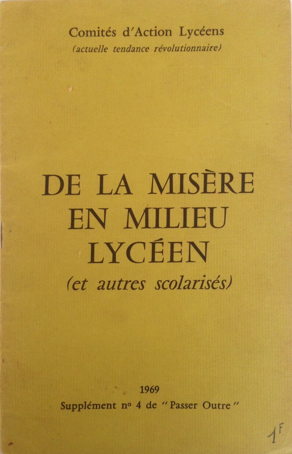 Lacout, Dominique et al.. De la Misere en Milieu Lyceen (et Autres Scolarises). Paris: Passer Outre / Maspero, 1969. 16 p.; 21 x 13 cm; olive green wrappers with text in black.