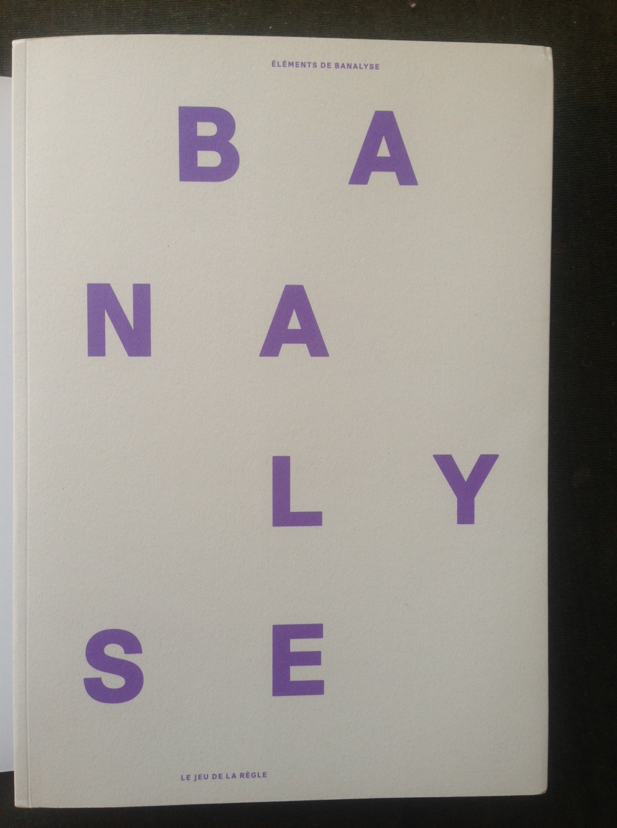 Clavreul, Marie-Liesse and Thierry Kerserho (Ed.). Éléments de banalyse. Caen: Editions Le Jeu de la Règle, June 2015. 1 vol. (561 + XLIV p.); profusely illustrated.; 29 x 20 cm.; purple wrappers with text in white. With a preface by Pierre Bazantay and Yves Helias, co-founders of the Congrès Ordinaire de Banalyse.