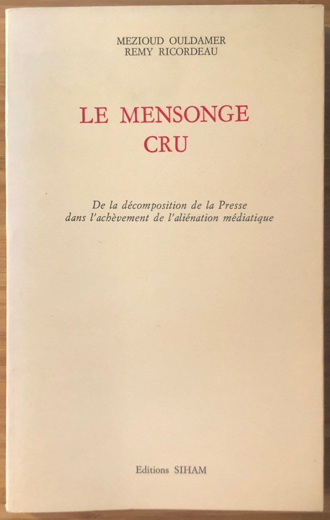 OULDAMER, Mezioud and RICORDEAU, Remy. Le Mensonge cru. De la Décomposition de la Presse dans l’Achèvement de l’Aliénation médiatique. Paris: SIHAM, November 1988. 123 p.; 22 x 14 cm. Cream cover