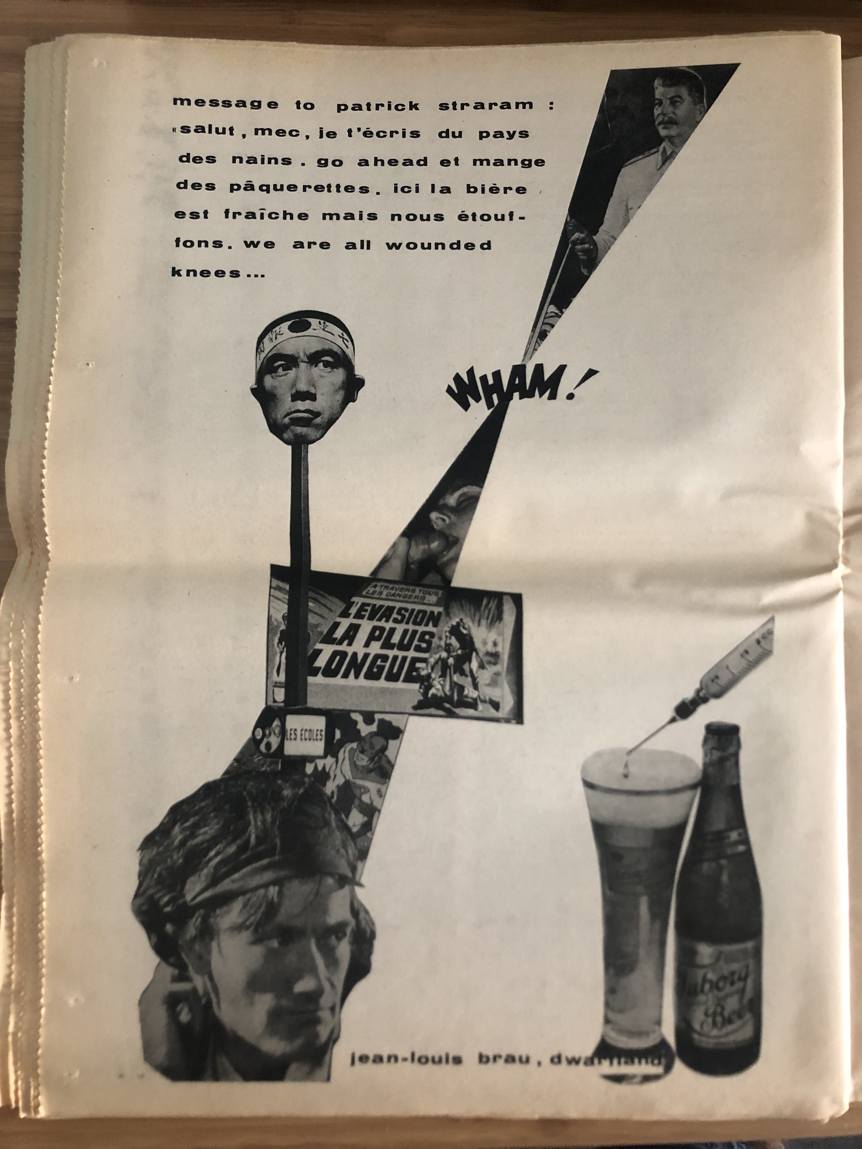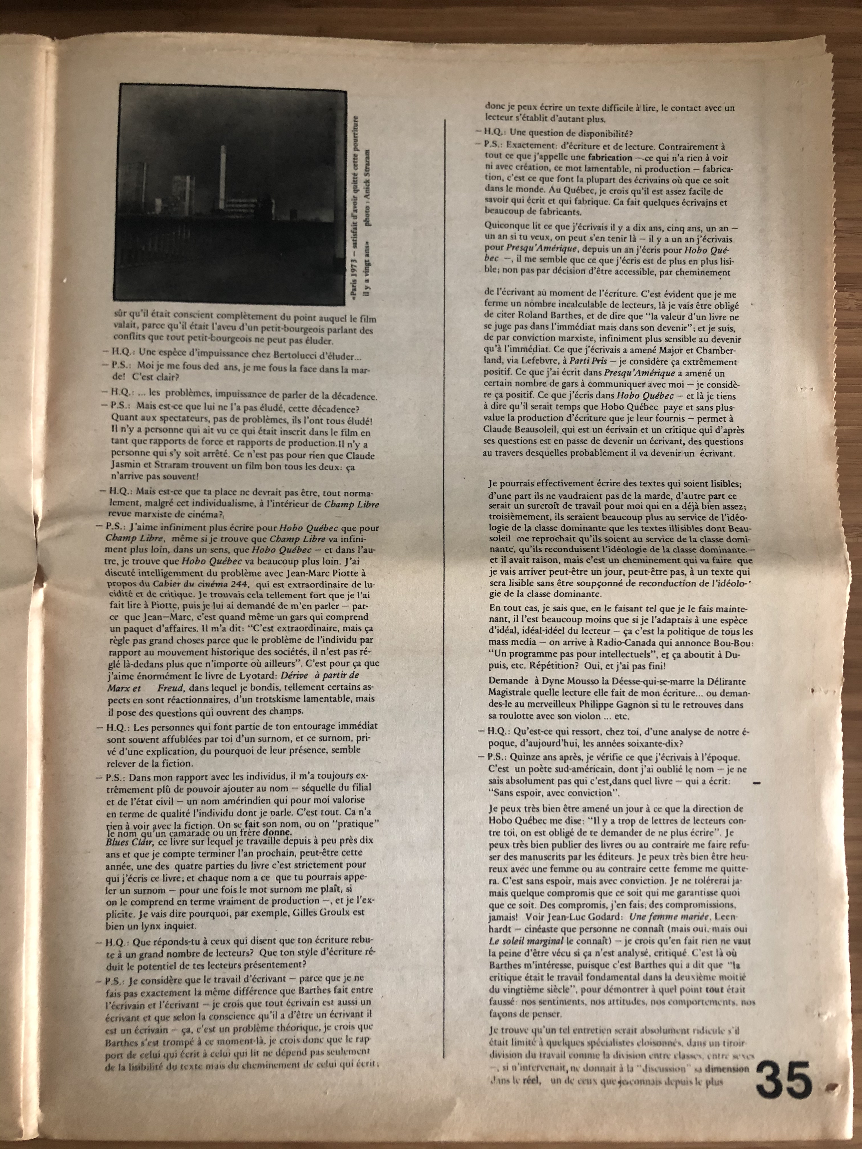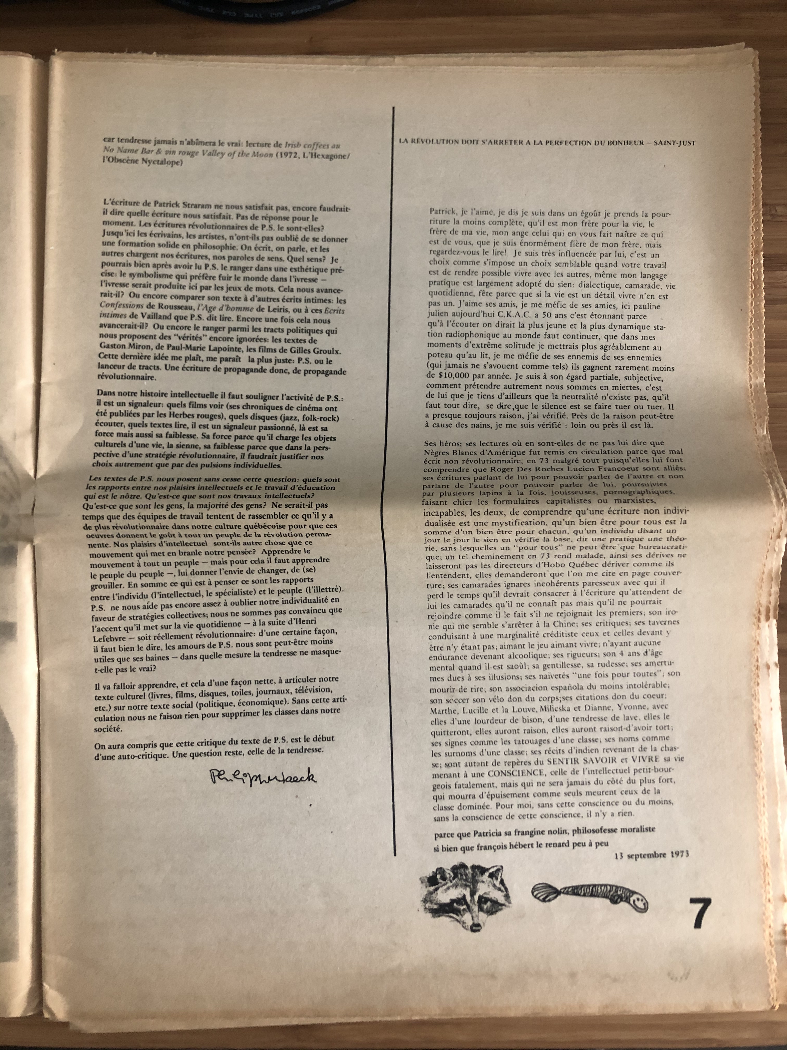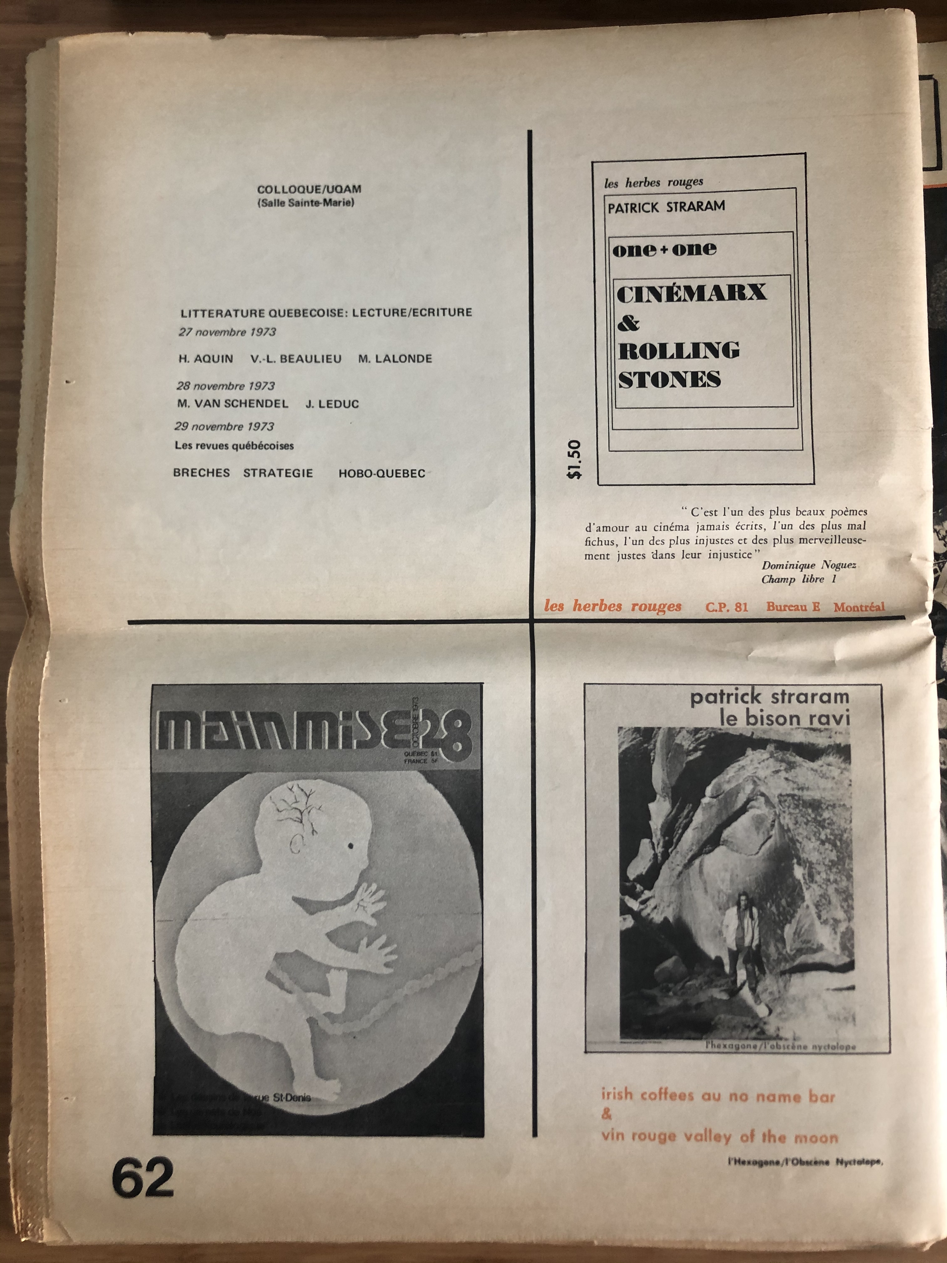 Special issue of the Quebec counterculture magazine dedicated to Patrick Staram, “Le Bison Ravi”. Features a 10-page long interview of Straram, where he shares details about his youth (including his friendship with the Lettristes in Saint-Germain), discusses the literary (Boris Vian, Roland Barthes, Henri Lefebvre, etc.), musical, and cinema figures that influenced him, and more (pp 26-36). Jean-Louis Brau is given 2 pages to share memories of his friendship with Straram (pp. 46-47). Also includes contributions by a plethora of Quebecois avant-garde figures such as Luce Guilbeault, Denys Arcand, Gilbert Langevin, Gilles Archambault, Louis Geoffroy, Lucien Francoeur, Nicole Brossard, Jean-Marc Piotte, Pierre Vadeboncoeur, Pierrot Léger, Gilles Groulx, Robert Roussil, Pauline Julien, etc.