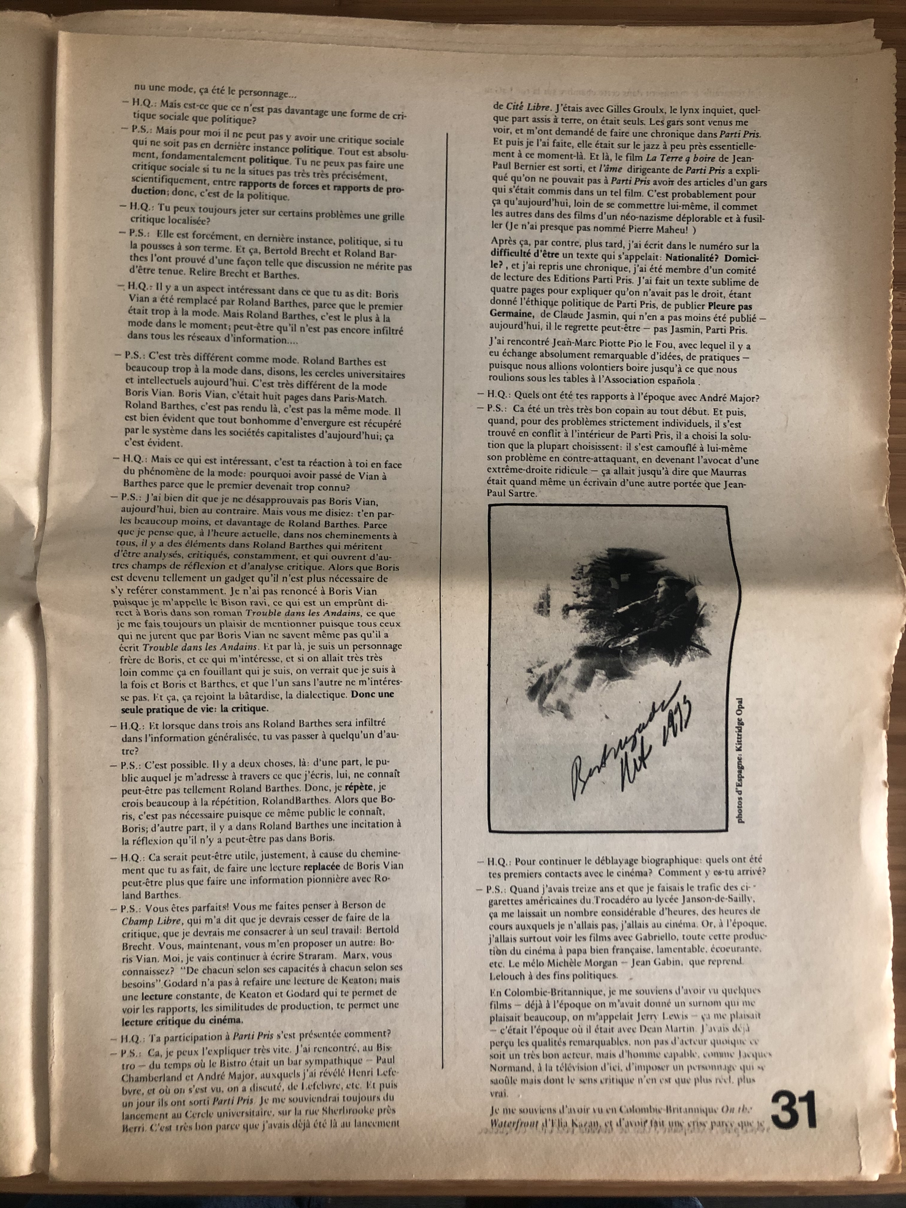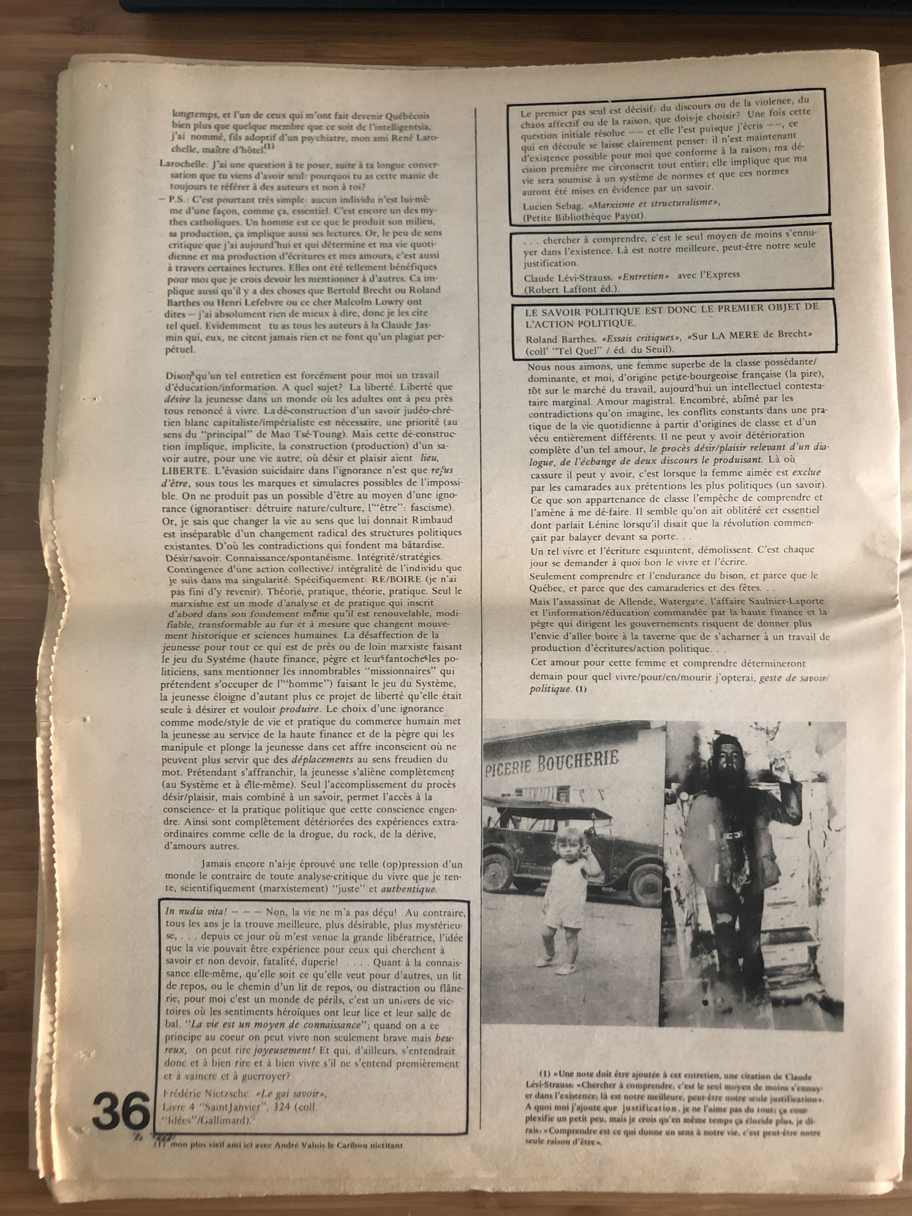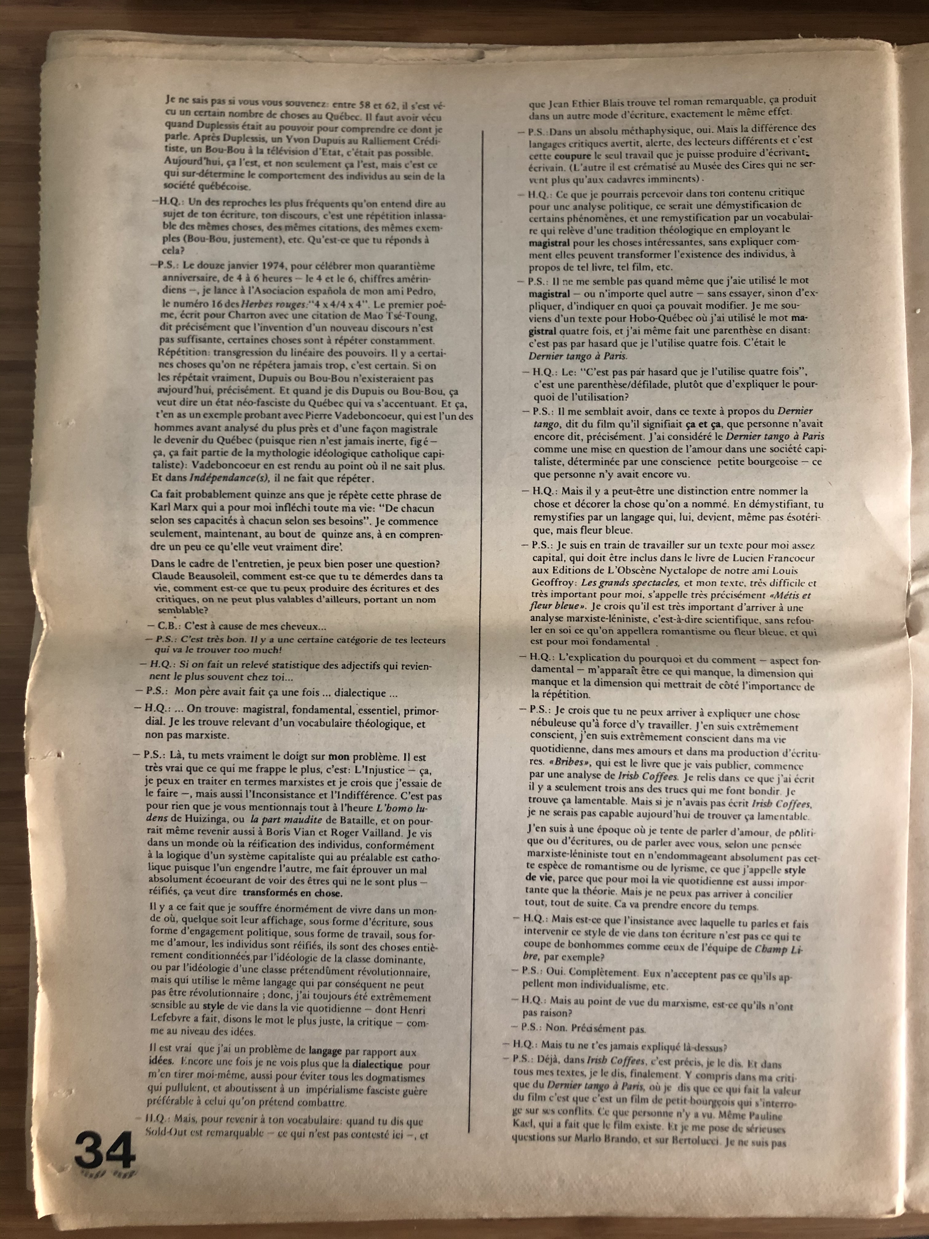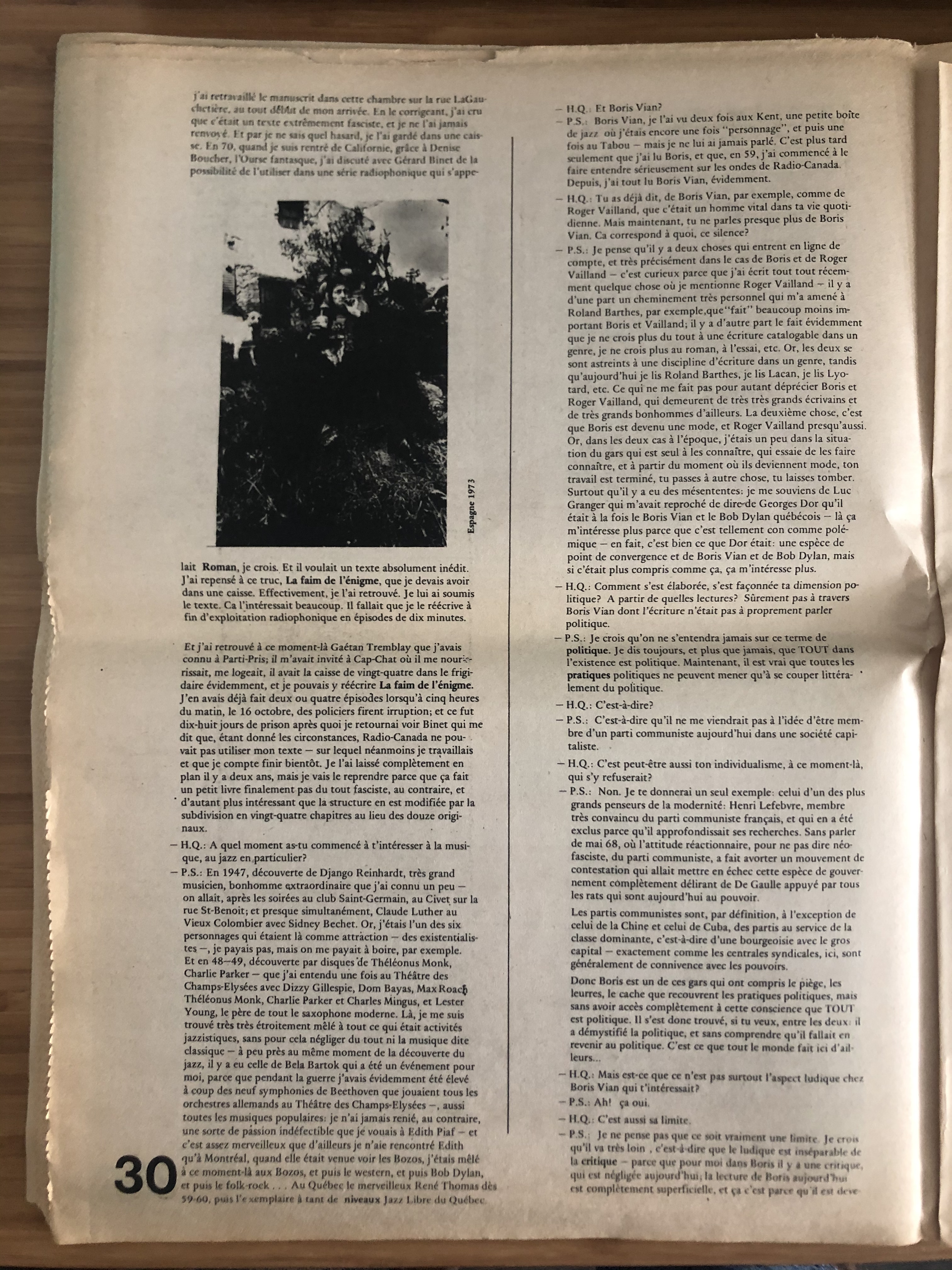 Special issue of the Quebec counterculture magazine dedicated to Patrick Staram, “Le Bison Ravi”. Features a 10-page long interview of Straram, where he shares details about his youth (including his friendship with the Lettristes in Saint-Germain), discusses the literary (Boris Vian, Roland Barthes, Henri Lefebvre, etc.), musical, and cinema figures that influenced him, and more (pp 26-36). Jean-Louis Brau is given 2 pages to share memories of his friendship with Straram (pp. 46-47). Also includes contributions by a plethora of Quebecois avant-garde figures such as Luce Guilbeault, Denys Arcand, Gilbert Langevin, Gilles Archambault, Louis Geoffroy, Lucien Francoeur, Nicole Brossard, Jean-Marc Piotte, Pierre Vadeboncoeur, Pierrot Léger, Gilles Groulx, Robert Roussil, Pauline Julien, etc.