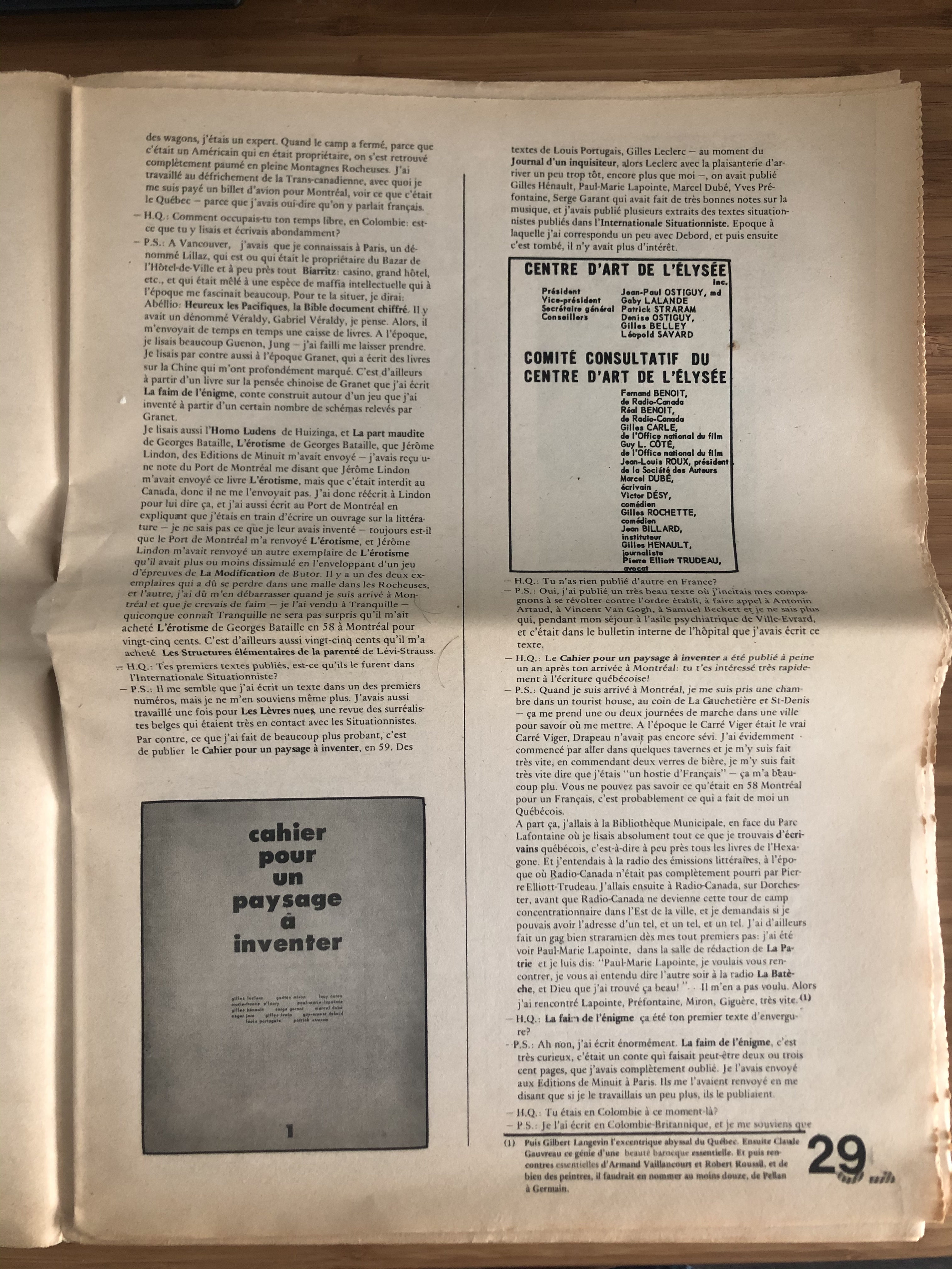 Born in Paris in 1934, Patrick Straram was a member of the Internationale Lettriste and a close (and early) friend of Guy Debord. He left the I.L. in 1954 when he fled to Canada to avoid military conscription He remained close to Debord for several, as attested by their warm letters. Straram released the Cahier pour un Paysage a Inventer in 1960, including both articles from the Situationist International and poems and critical texts by Quebec writers (Gaston Miron, Marie-France O’Leary, Paul-Marie Lapointe, Gilles Hénault, Serge Garant, Marcel Dubé…). He ultimately became an iconic figure of Quebec’s counterculture scene.