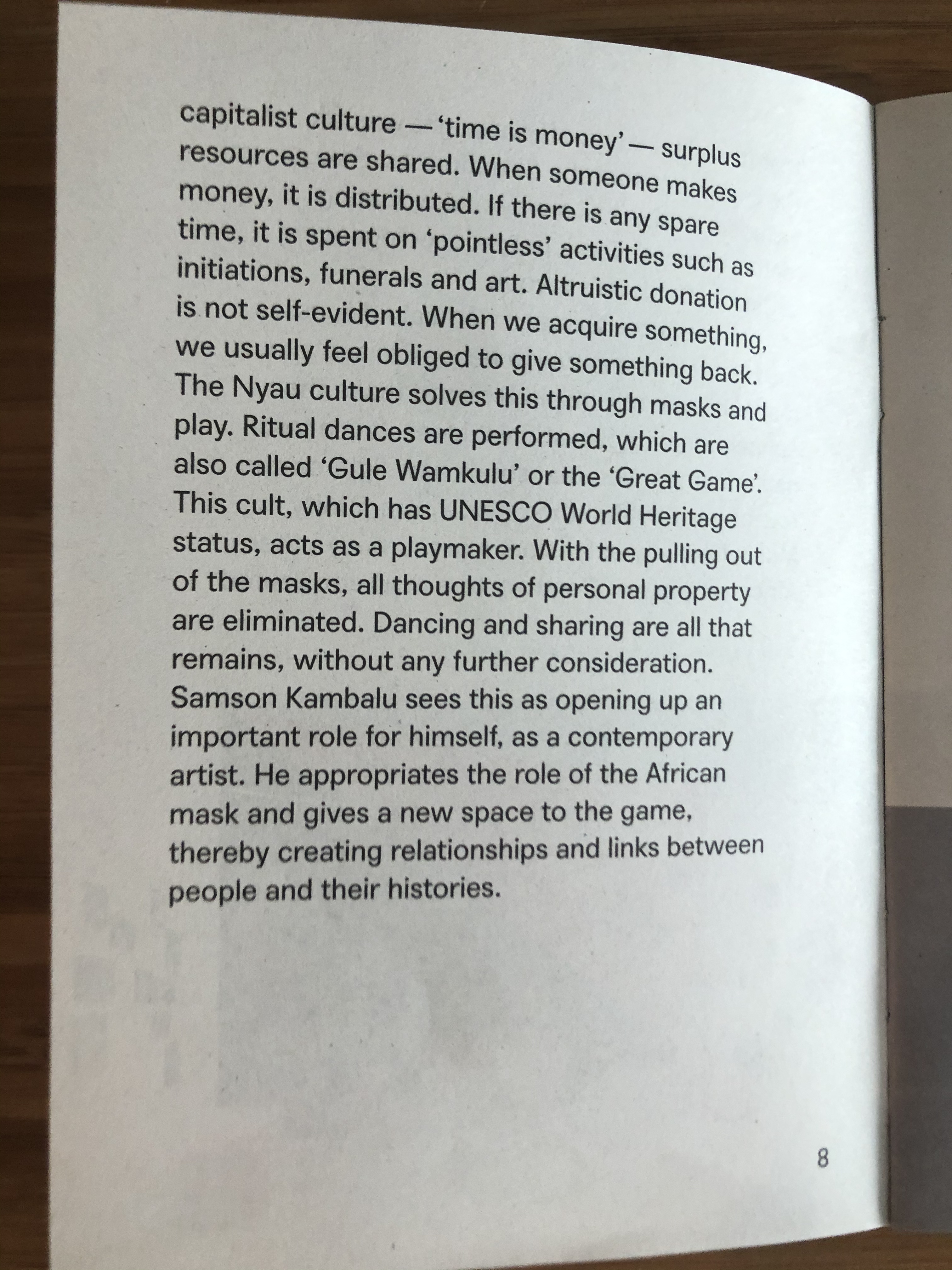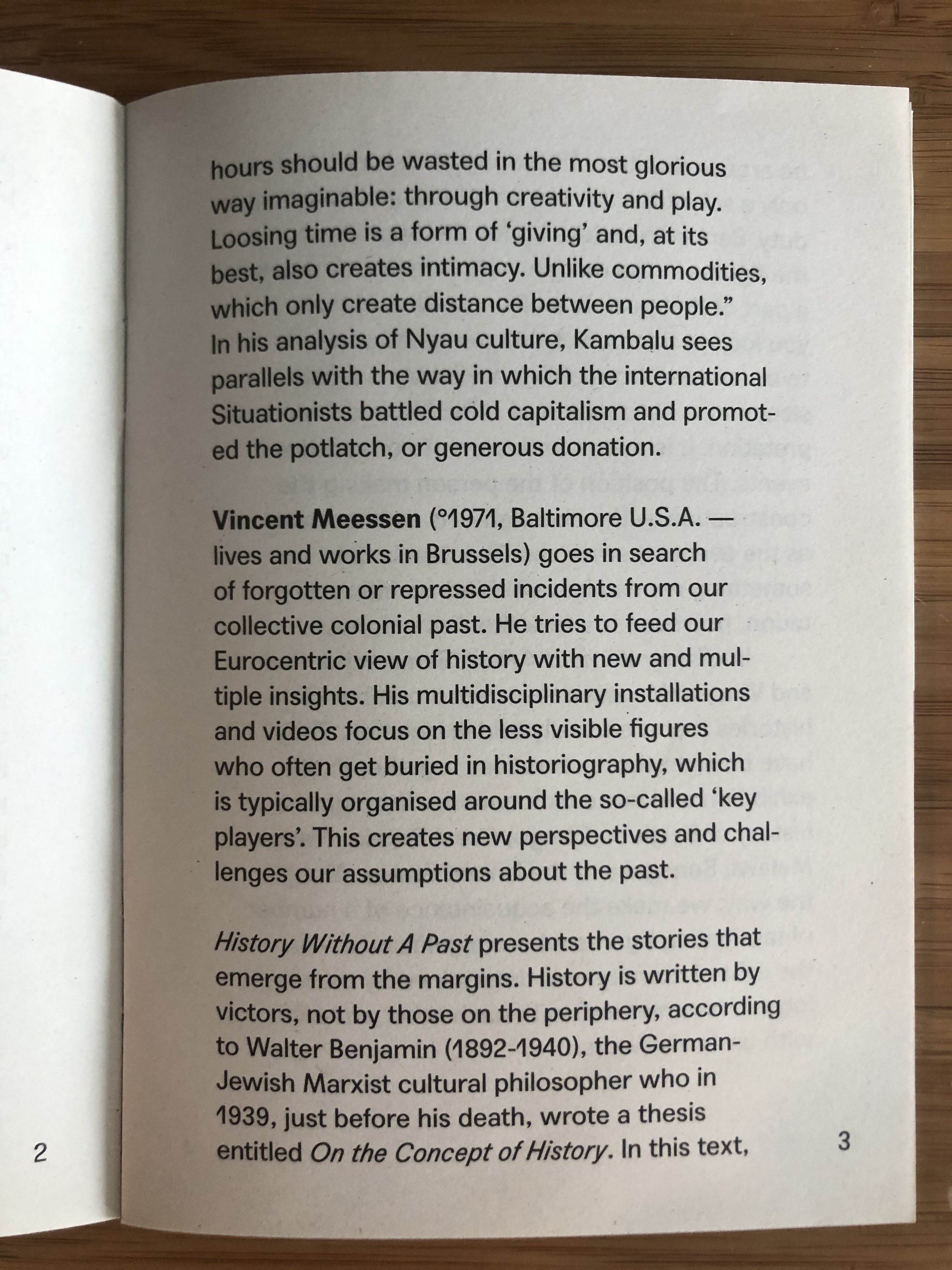 Booklet published on the occasion of Vincent Meessen and Samson Kambalu’s exhibition at the Mu.Zee in Ostend from 01/02/2020 to 17/05/2020. Features short biosketches of the artists, and short presentation of the art pieces, including