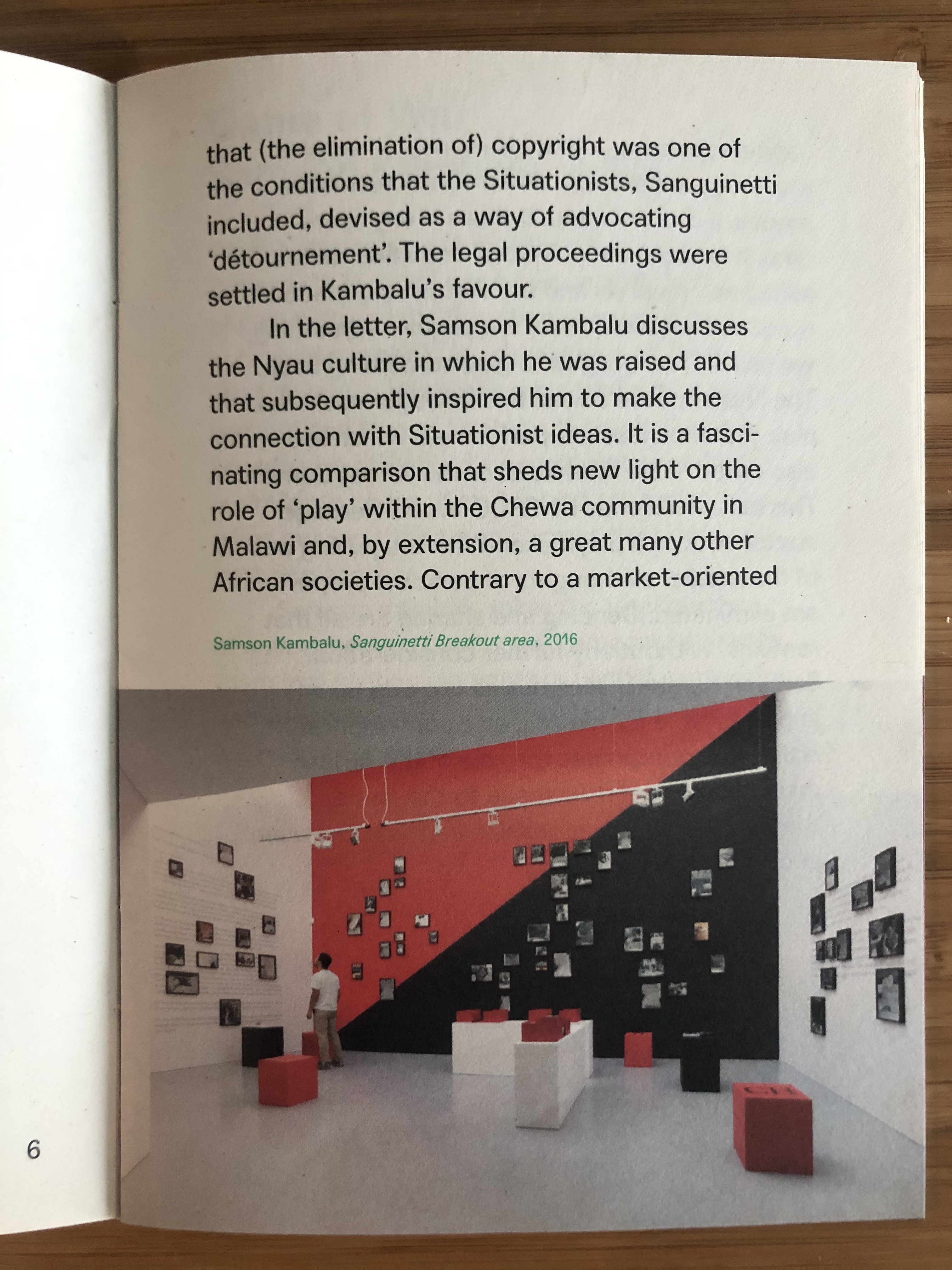 Sanguinetti Breakout Area : a sheet-by-sheet reproduction of Sanguinetti’s archive, which was first exhibited in Venice in 2015. This led Sanguinetti to sue Kambalu for copyright infringement, with Kambalu ultimately prevailing in court.