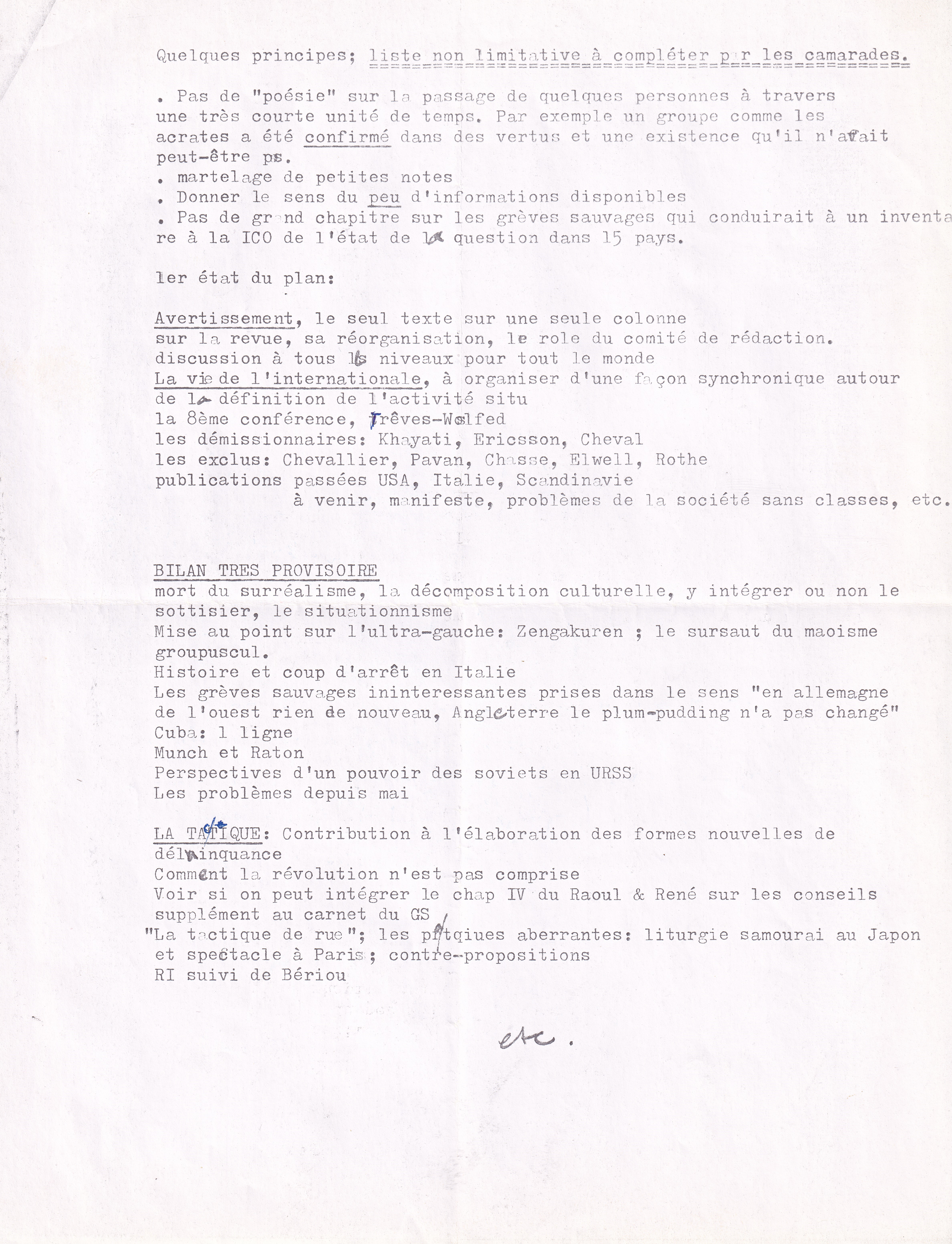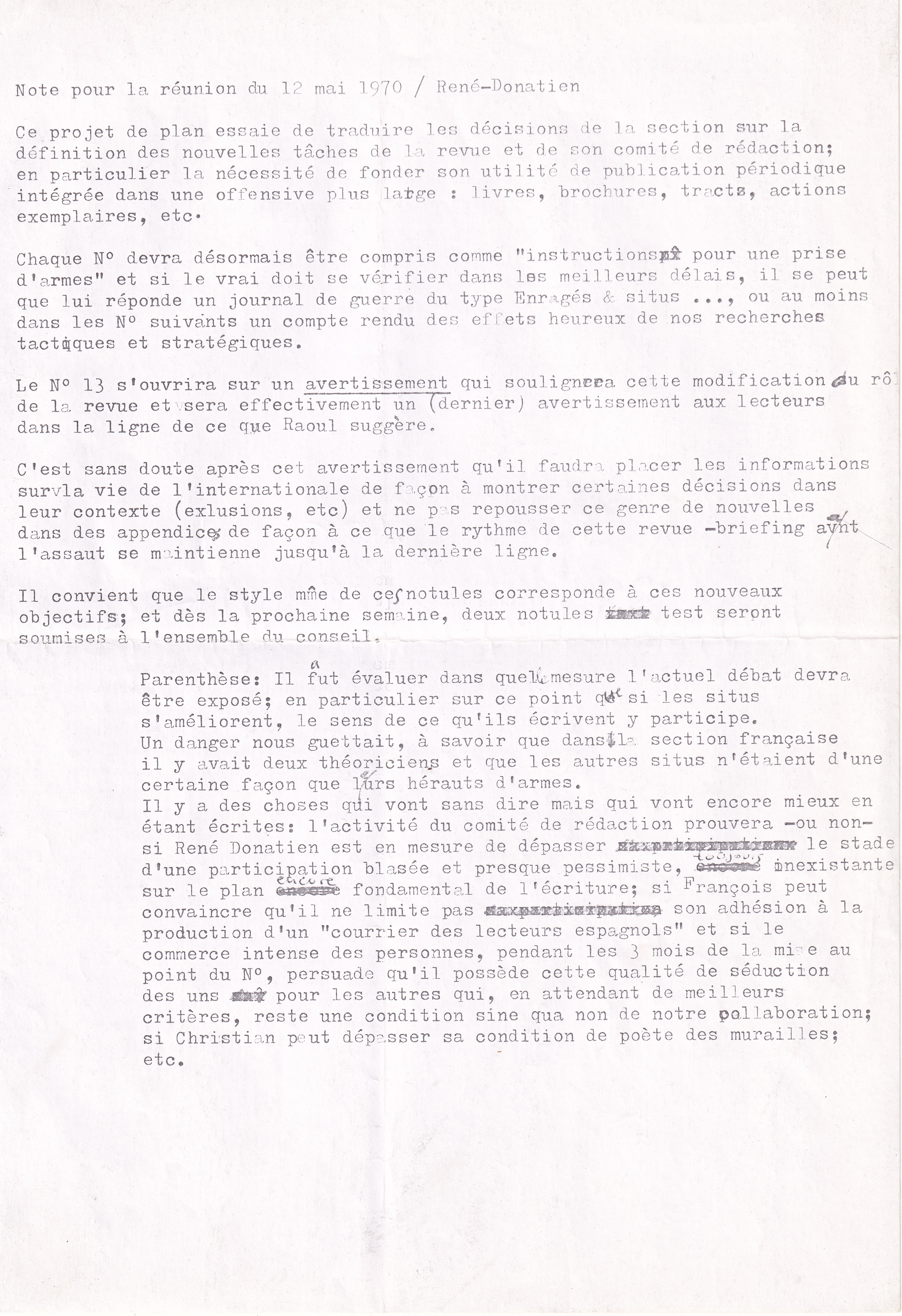 Important internal document that documents changes to be made to Internationale Situationniste ahead of issue #13 (which would never be released). Specifically, the issue was to open with a warning (Avertissement) penned by Debord. Includes a draft of the table of contents.