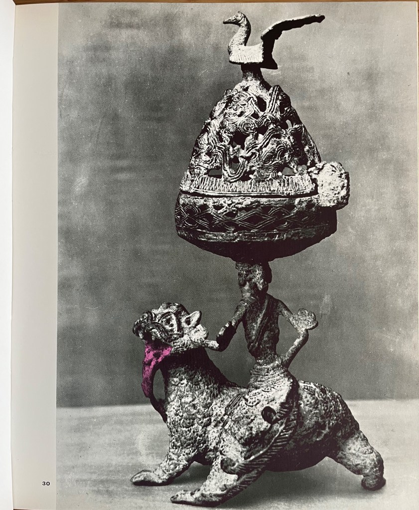 Published as the third volume of the Bibliotheque d’Alexandrie (Library of Alexandria), La Langue verte et la cuite is the result of a collaboration between Noel Arnaud from the College de Pataphysique and visual artist Asger Jorn. The work is spectacular in many respects. First, its sheer physicality: the book is almost 5 cm thick and weighs over 2 kilograms. Next, its rich production: La Langue verte includes 315 color illustrations and a luxuriously printed dust jacket. Last but not least, its many ambitions – including the articulation of a new (half-serious) art / science (“la cuisine des langues”) and a parody of structuralism, which was then all the rage in France. In many ways, La langue verte can be read as a situationist detournement of Claude Levi Strauss’ Le Cru et le Cuit (The Raw and the Cooked, 1964), which investigated the role of cooking in the transition from nature to culture.