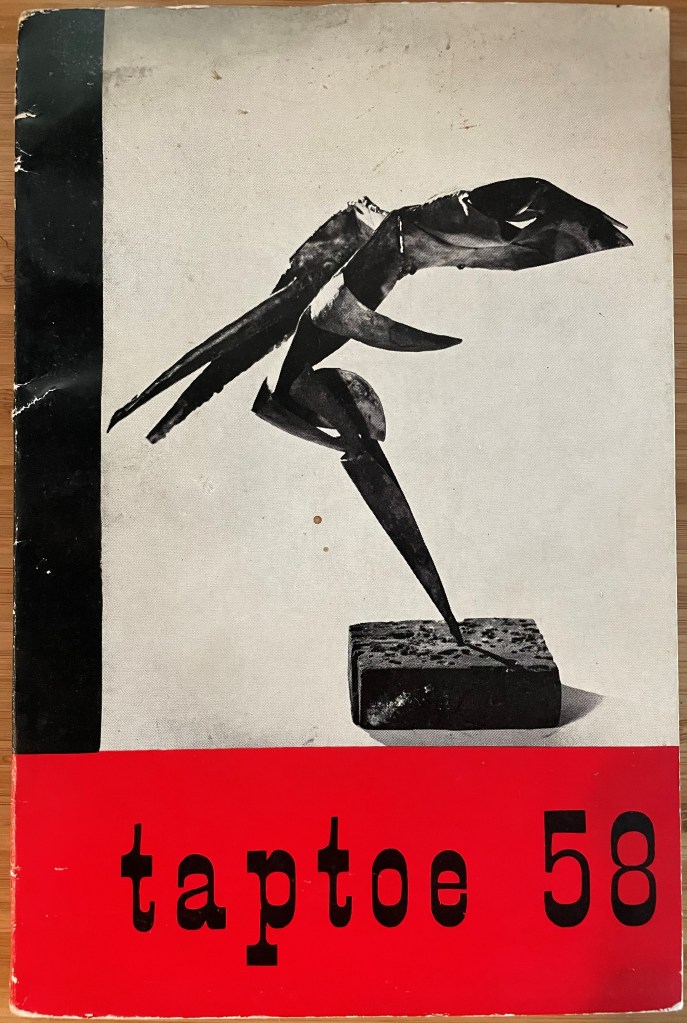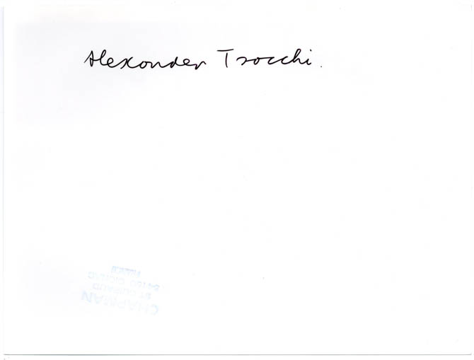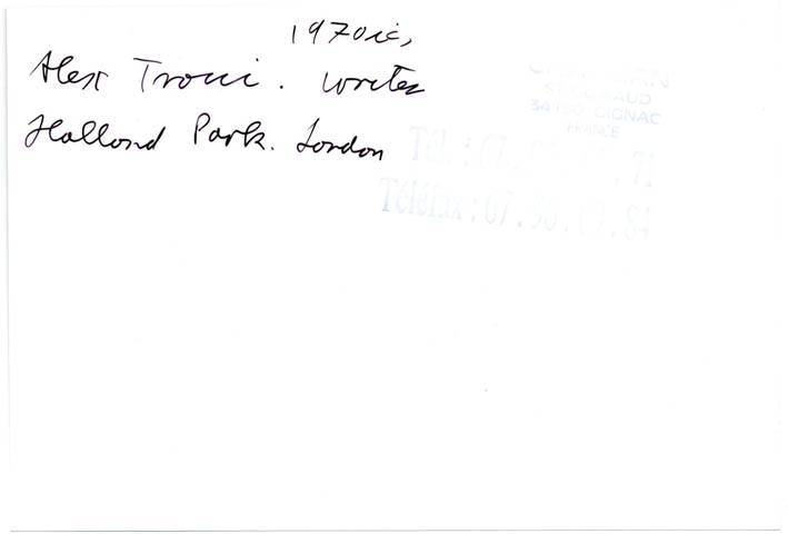 The photograph — the work of Harold Chapman – shows Trocchi in his book-lined study, seated beside a coffee table covered with, among other objects, a small filing cabinet, cigarette packets, two wine glasses and an opened bottle of Möet & Chandon, while Sally Child, introduced to Trocchi by Robert Creeley’s wife, Penny, and his lover for the last seven years of his life, looks on. Photographer’s stamp and ‘Alexander Trocchi’ written out in ink by the photographer to verso.