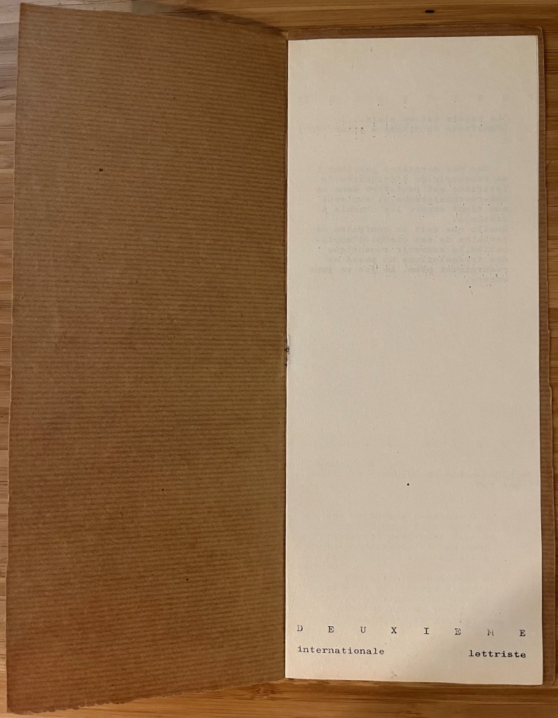 Deuxième internationale lettriste. 4 p.; 10.5 x 27 cm.; brown wrappers (kraft paper).