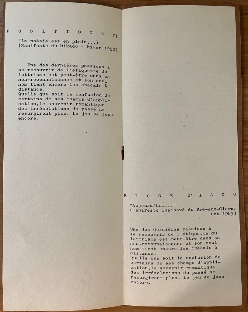 First and only publication of the short-lived Deuxième internationale lettriste, which was founded by Jean-Louis Brau, Gil Wolman and François Dufrêne as an offshot of Lettrisme. Includes short, signed texts by Brau (L’Asymptote toujours) and Wolman “(L’Art a posteriori”) and two unsigned texts (“Positions II” and “Eloge d’Isou”). The front wrapper includes the thumbprints of the authors.