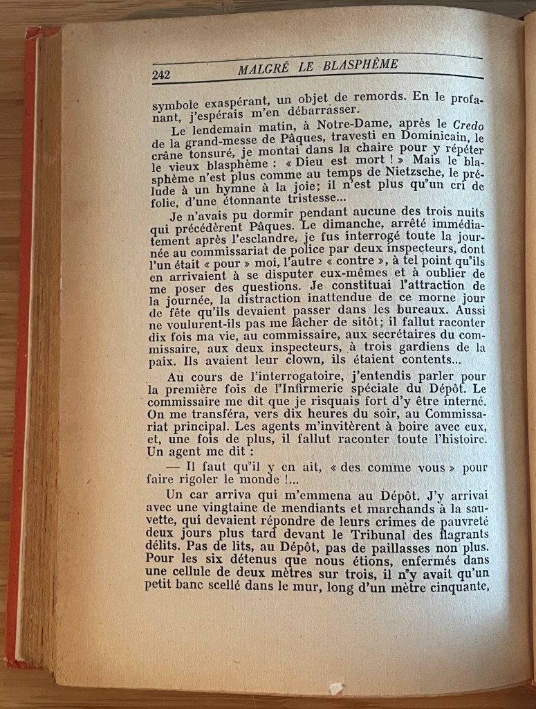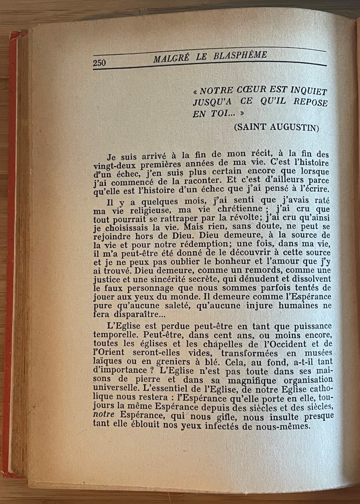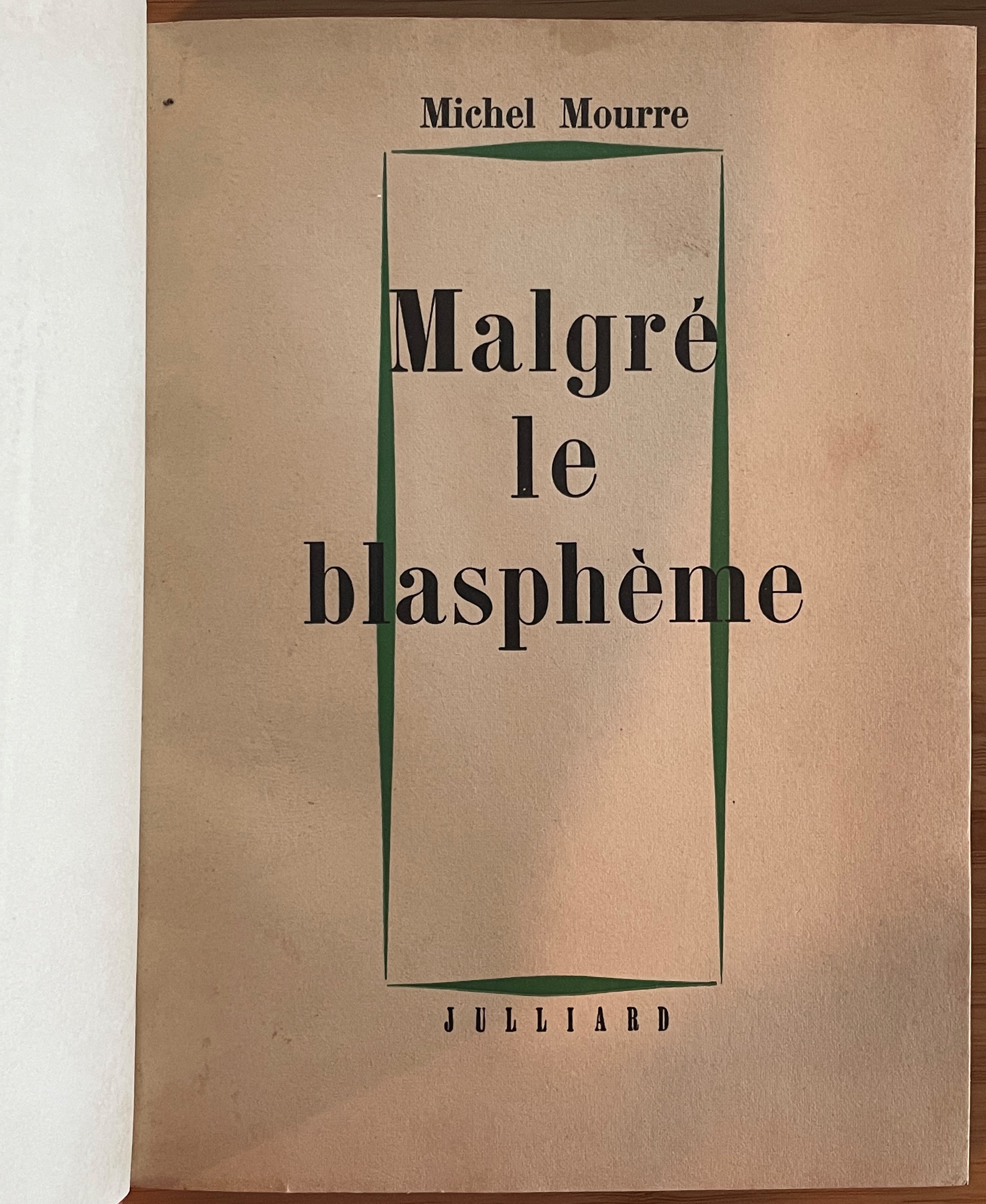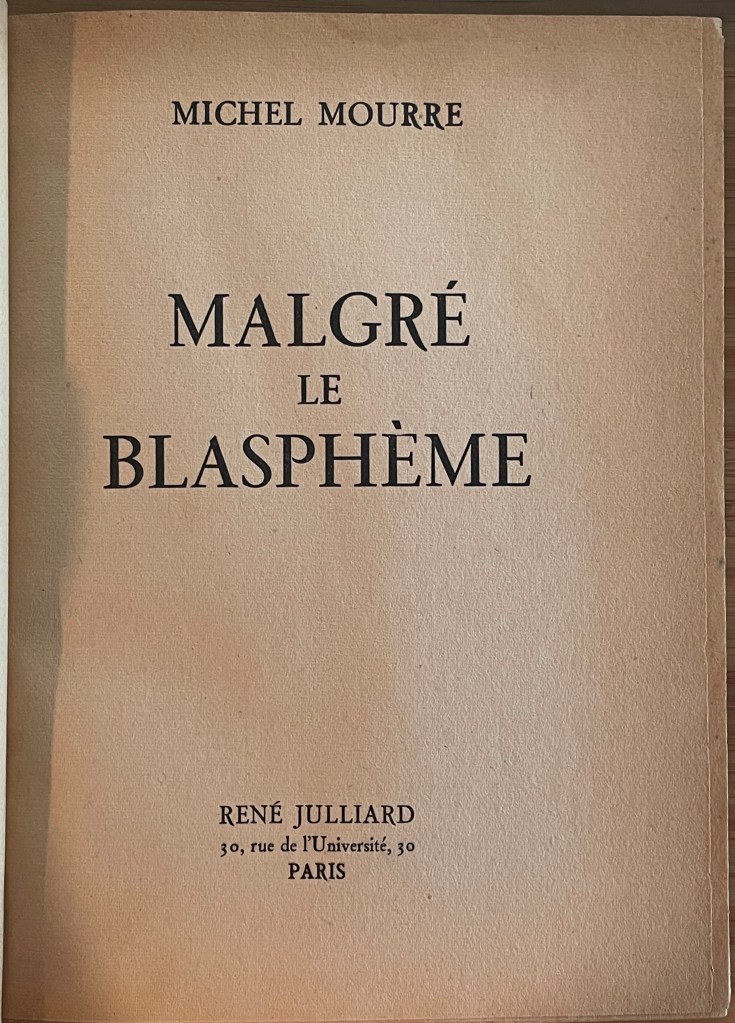 MOURRE, Michele. Malgré le blasphème. Paris: Julliard, Jan. 1951. 254 p.; 14.5 x 19.5 cm.; white cover in contemporary orange binding.