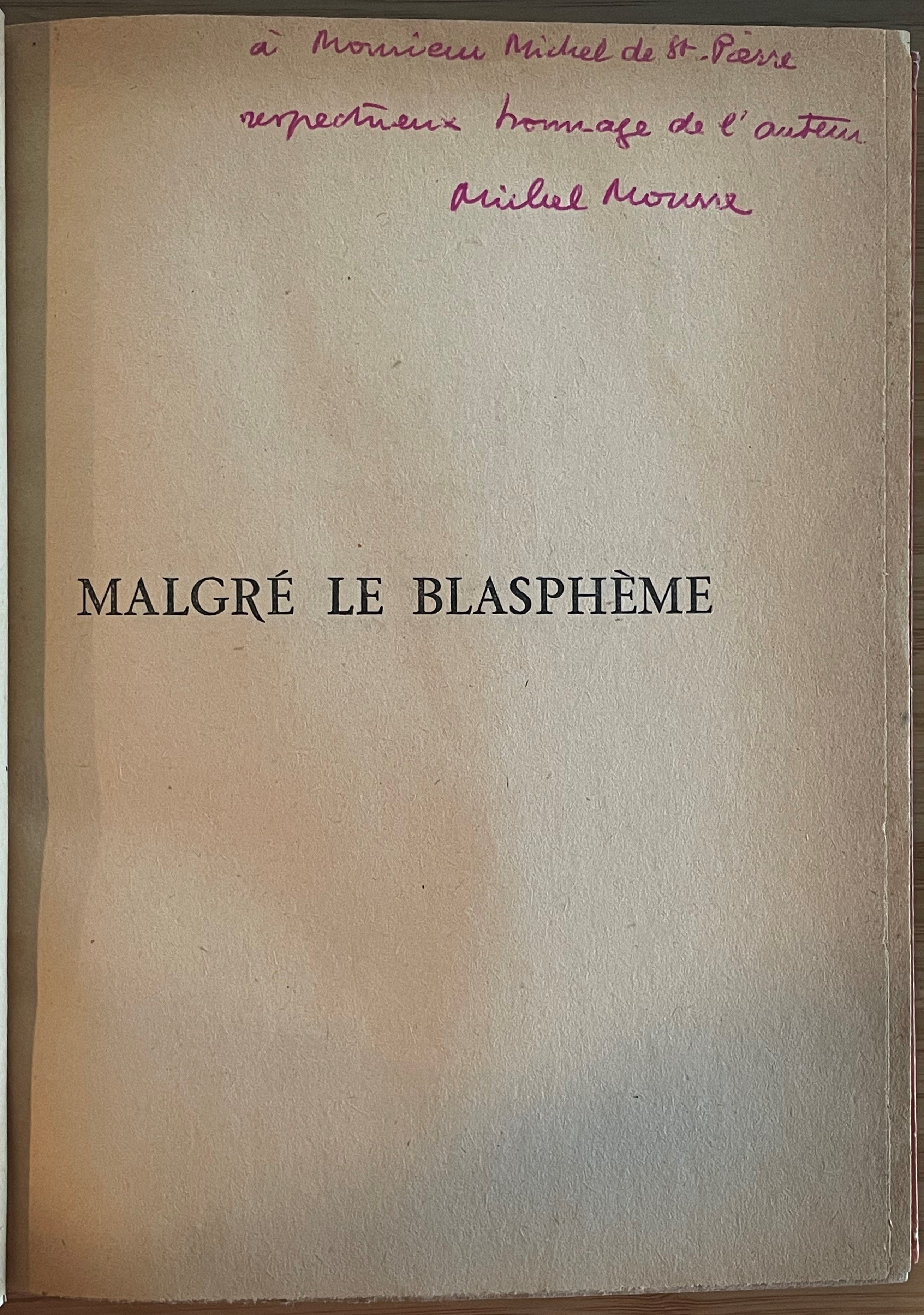 Mourre would later recant (thus the title of this book – In spite of blasphemy) and once again become a practicing Catholic. Our copy is exceptionally dedicated by Mourre to Michel de St-Pierre, a conservative catholic writer and the author of 1954 semi-autobiographical best-seller “The Aristocrats”