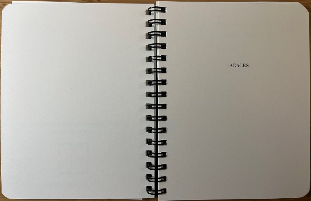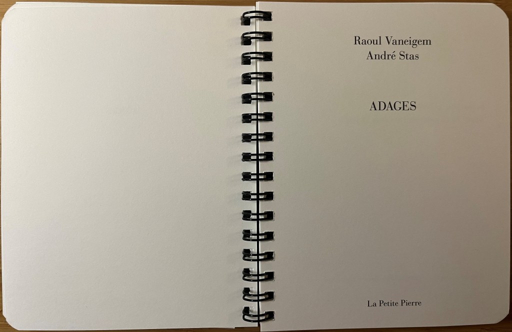 VANEIGEM, Raoul; STAS, André. Adages. Brussels: La Pierre d’Alun, 21 March 2022. 64 p.; 11 x 14 cm; ill. Cover with text in gold, housed in a black slipcase embossed with gold lettering.