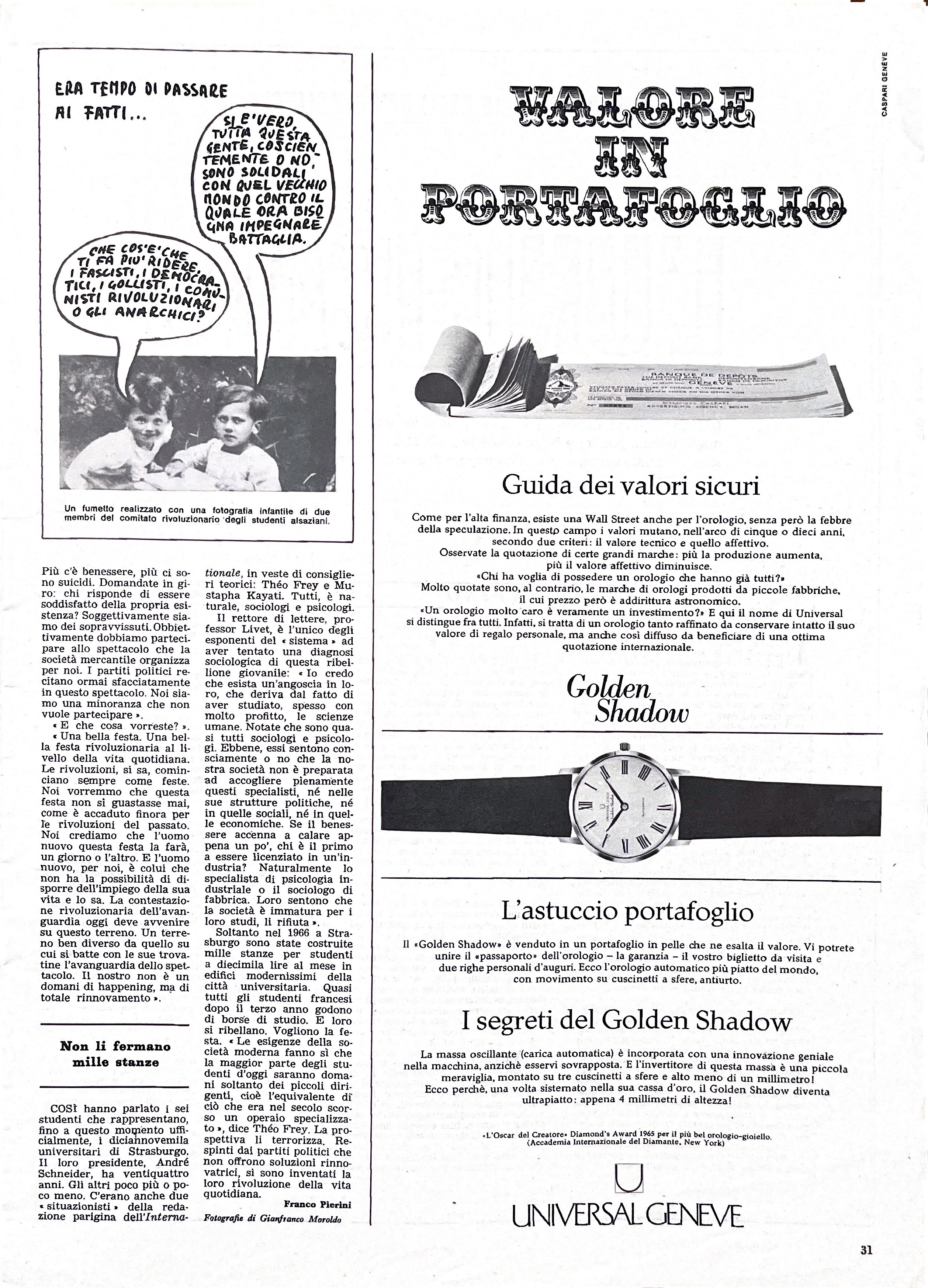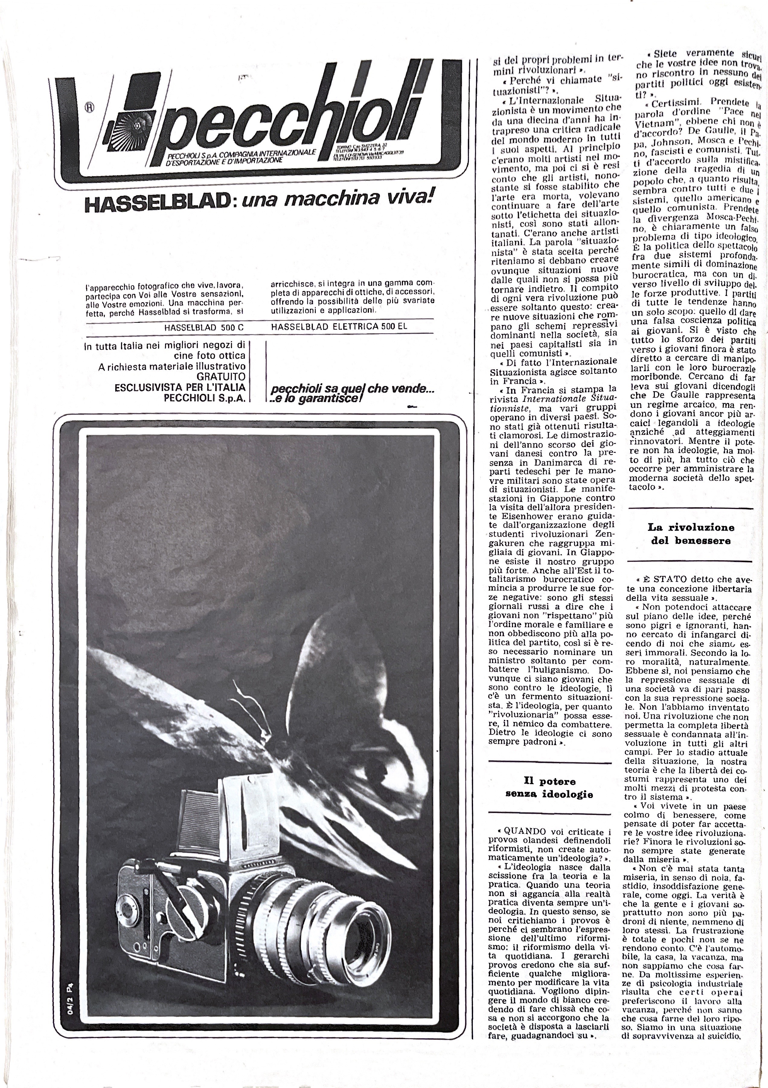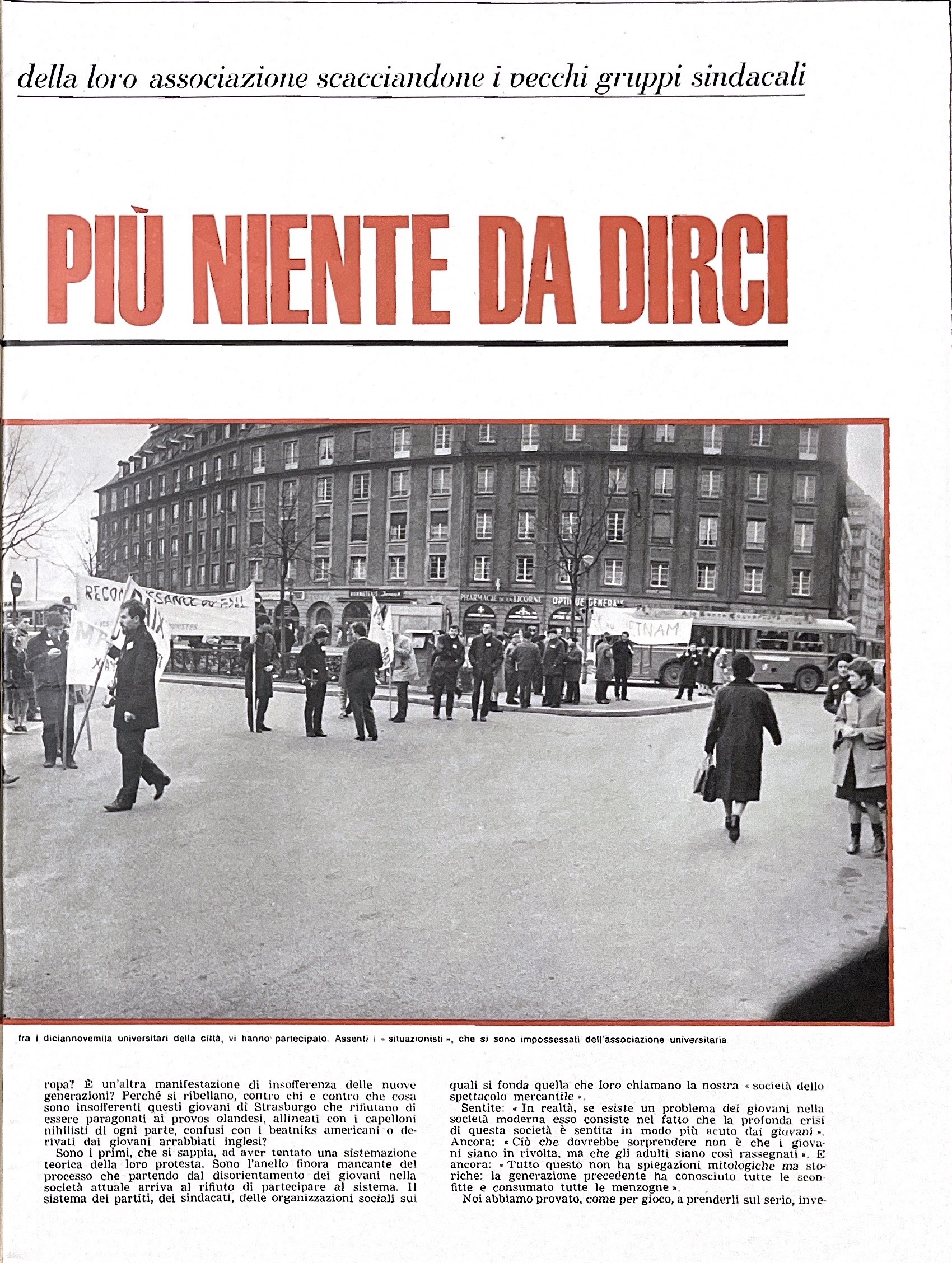 Article on the Strasbourg scandal in the Italian magazine L’Europeo (pp. 26-31) illustrated by a series of photographs by Gianfranco Moroldo, one of which captures a young Mustapha Khayati. Though rarely kind to journalists, The S.I. was particularly pleased by this article. In a letter to Mario Perniola dated 26 December 1966, Debord describes it as “very honest and sympathetic, despite the “objective information” aspect of the end” (Correspondance Vol. III, p. 187). He respected its author sufficiently to have him included among the recipients of the first issue of Internazionale Situazionista (letter to the Italian section dated 29 August 1969 in Correspondance Vol. IV, p.108). When Sanguinetti considered giving an interview to the press in 1972, Debord recommended that he reach out to Franco Pierini at L’Europeo (Correspondance Vol. IV, p.526). Finally, in 1972, Raspaud & Voyer describe it as “excelent, clear, and intelligent” (l’Internationale Situationniste : protagonistes / chronologie / bibliographie (avec un index des noms insultés), pp. 141)