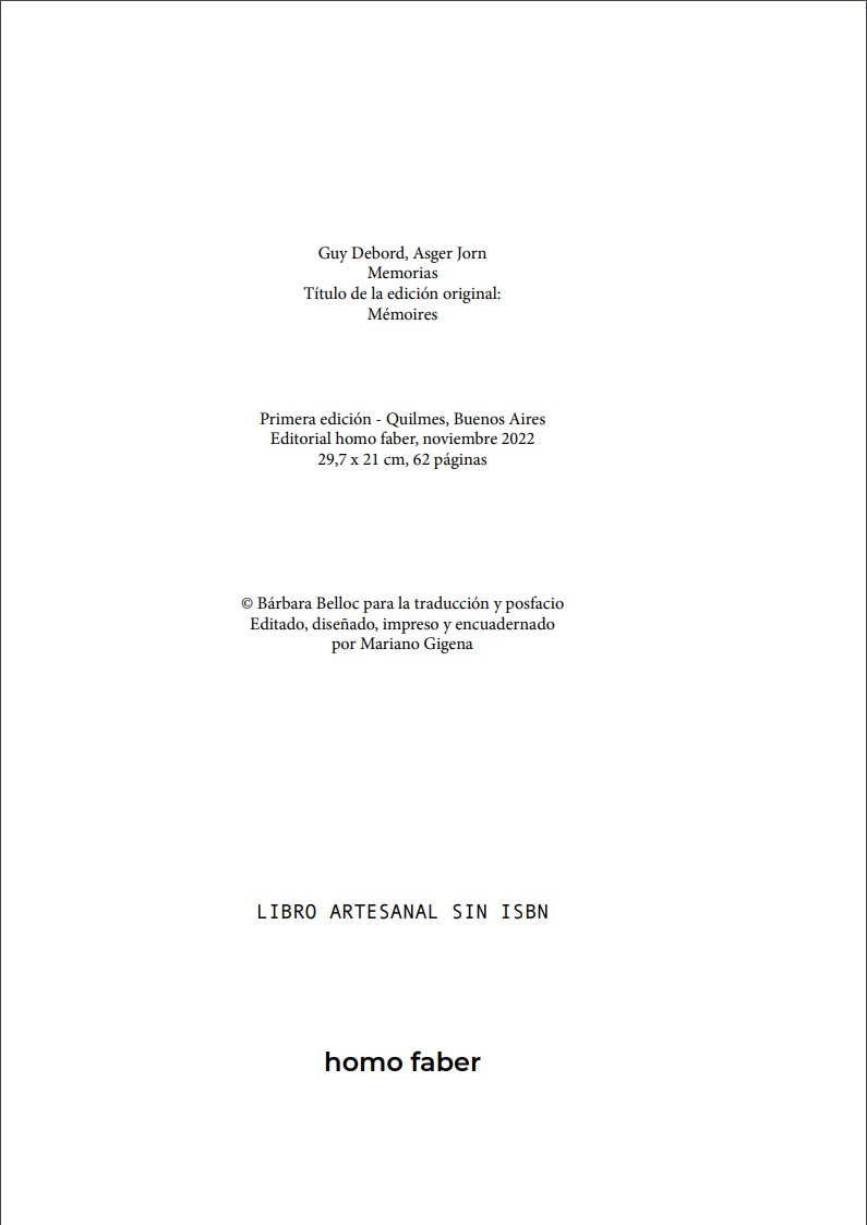 Produced by Mariano Gigena and published by Homo Faber in Buenos Aires in November 2022, this work is believed to be the first Spanish language edition of Memoires. The translation and postface are the work of Argentinean poet Bárbara Belloc. The book is printed on 150 gr paper using a Brother DCP-T420 for the images and Brother HL-J2360dw for the text. Only 50 numbered copies were created, all handmade. For more information, see here