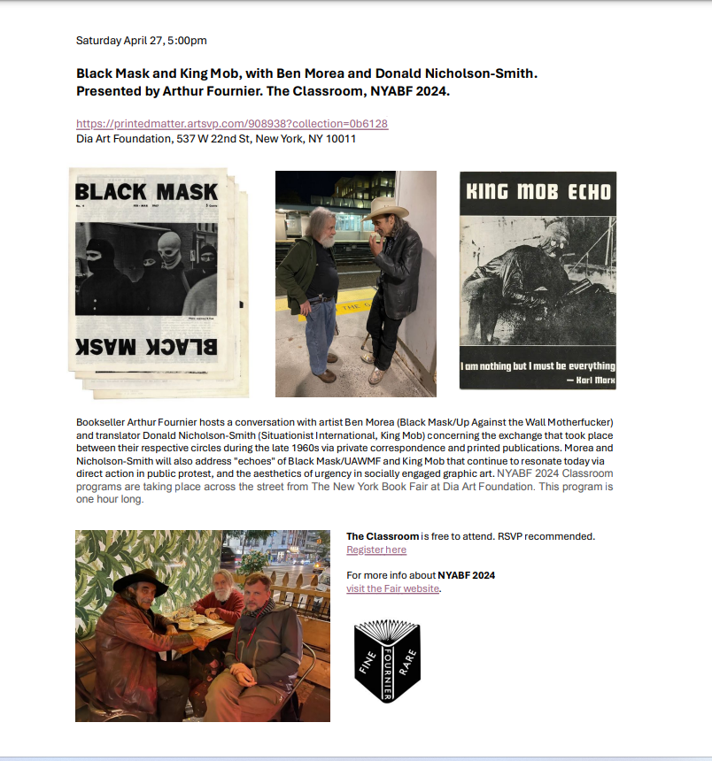 [Event] Black Mask and King Mob, with Ben Morea and Donald Nicholson-Smith 22 Monday Apr 2024 Posted by elhajoui in Uncategorized ≈ Leave a comment As part of the NY Art Book Fair, there will be a conversation between Ben Morea (Black Mask, Up Against the Wall Motherfucker) and Donald Nicholson Smith (King Mob, Situationist International). Details below. Share this: Click to share on X (Opens in new window) X Click to share on Facebook (Opens in new window) Facebook Like Loading... Related