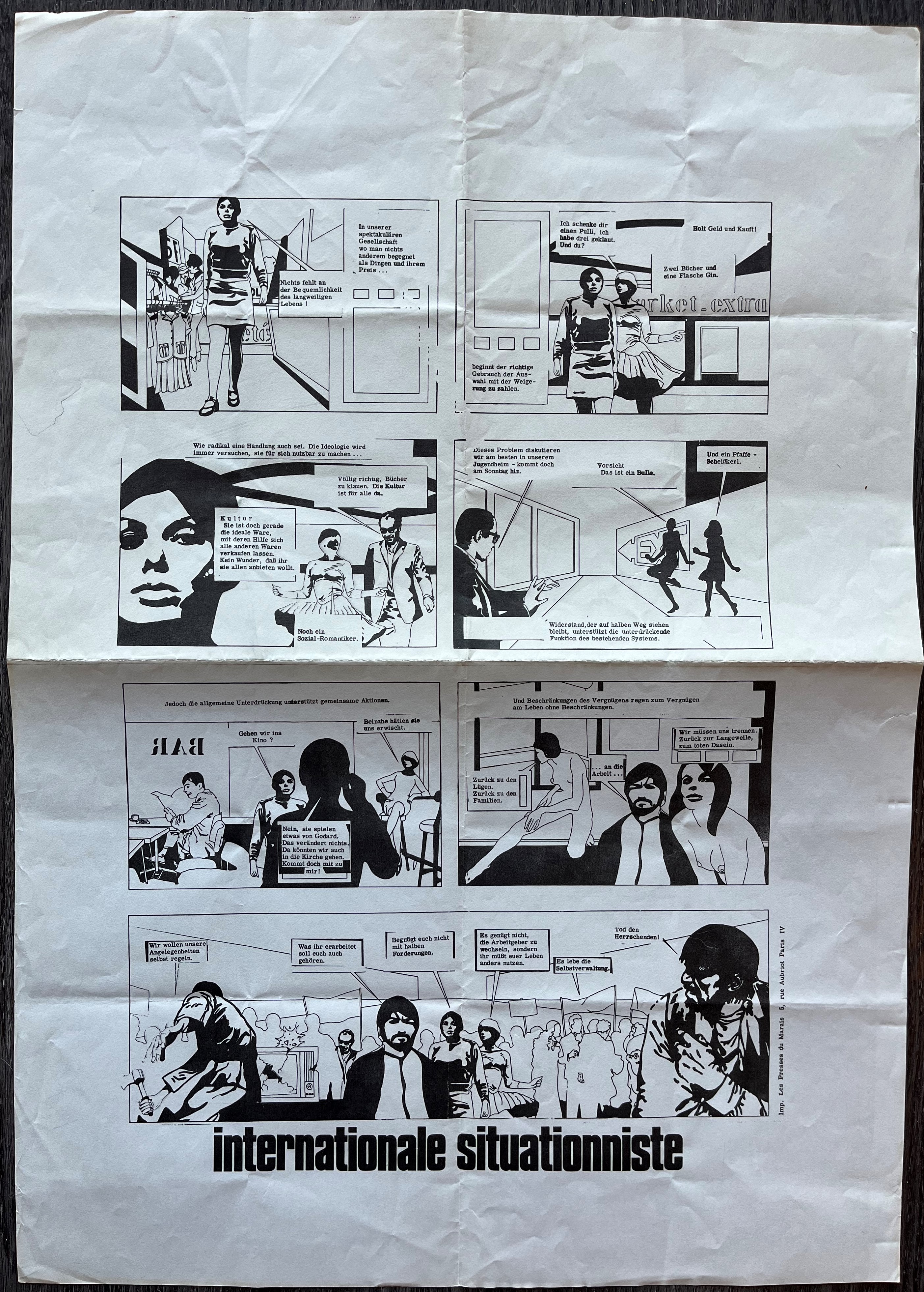 [INTERNATIONALE SITUATIONNISTE]. [Dans le décor spectaculaire où le regard ne rencontre que les choses et leur prix…] In Unserer Spektakulären Gesellschaft… n.p. [Germany?]: n.p., n.d. [1970s?]. Poster. Ill.; 61 x 43 cm.; black ink on thick white stock.