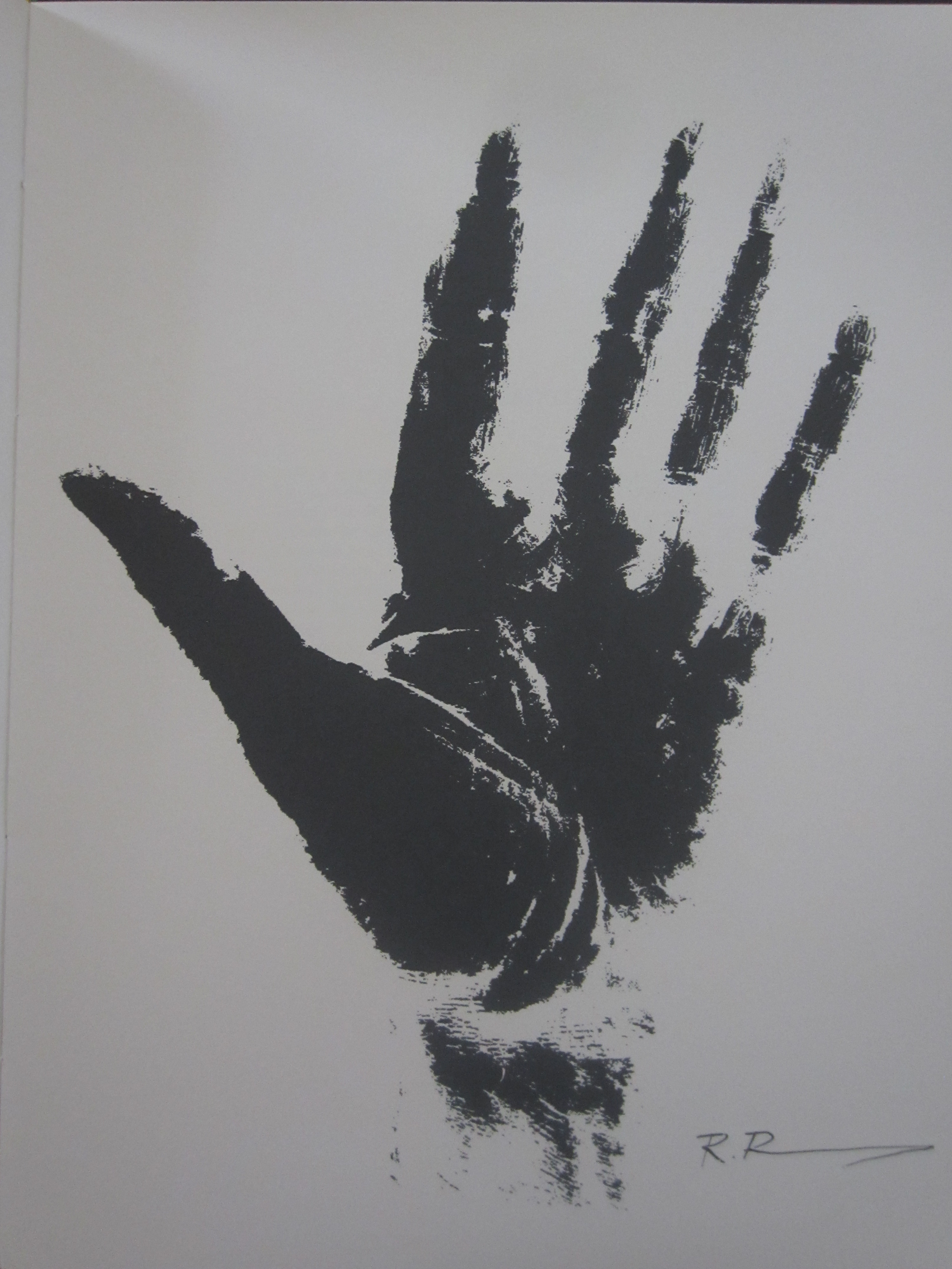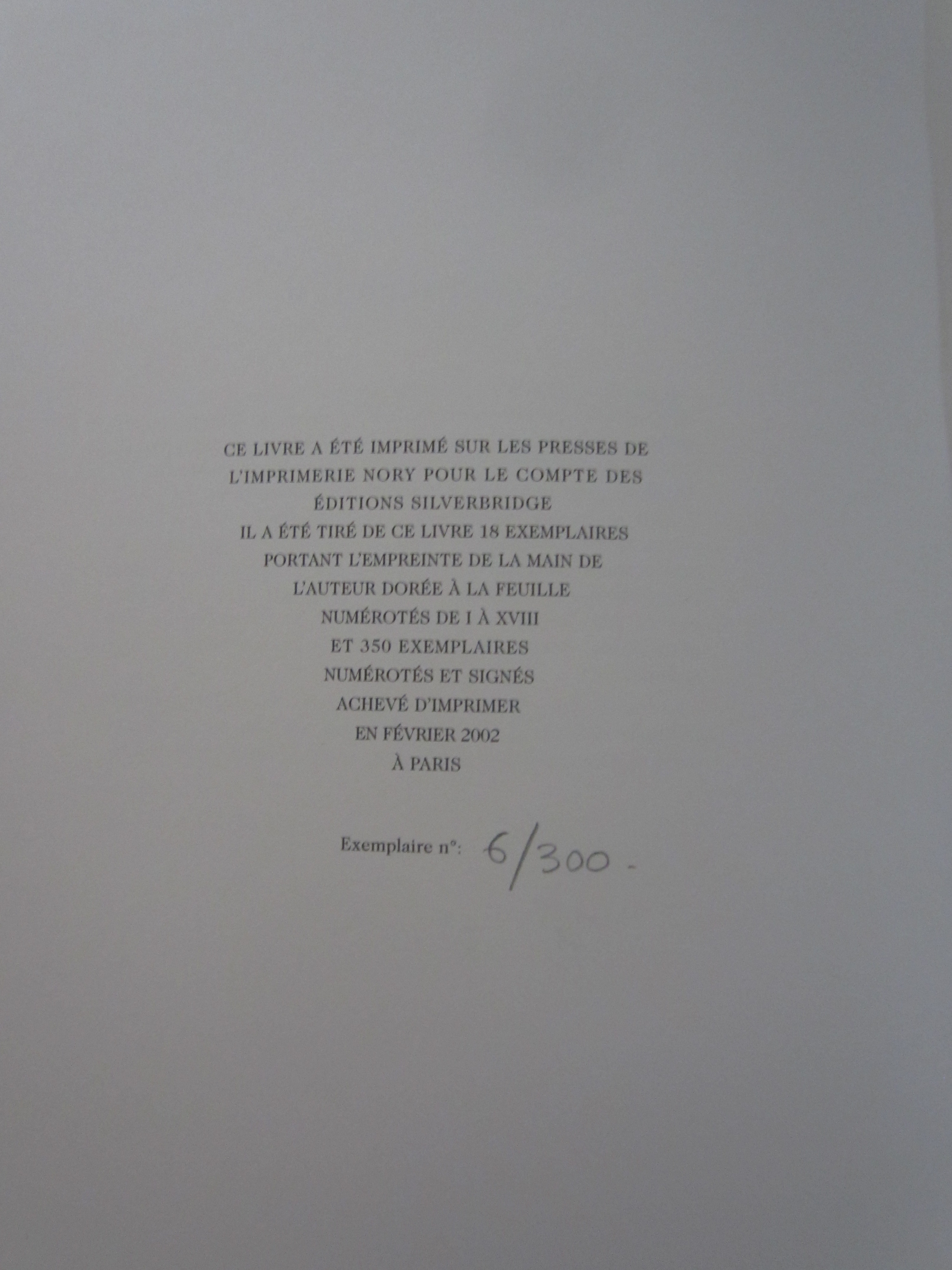 Rumney, Ralph. The Leaning Tower of Venice. Paris: Silverbridge, 2002. 36 p.; ill.; 20 x29 cm.; blue cover with text in black. Limited and numbered edition of 368. In the 18 copies of the special edition on old Lana, one page in the last chapter (La stampa non é l’impronta) carries the hand print of the author in gold leaf with his signature. In the edition of 350, the hand’s imprint is screen printed on Centaure paper by the Charnière printer