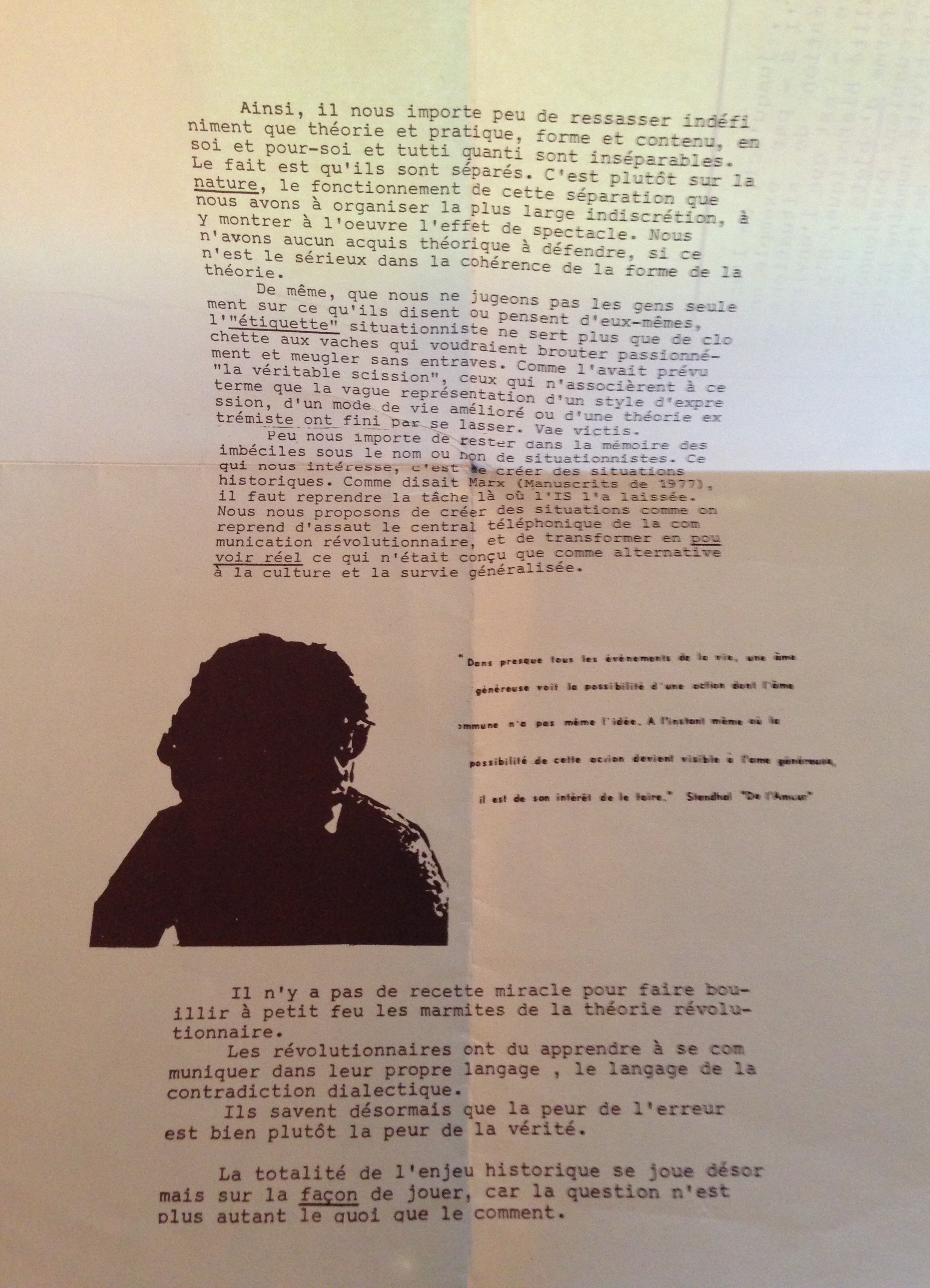 Brief (4 p.) text by Lemaitre against the Internationale Situationniste, originally published in the periodical La Lettre, no.38, January 1982.