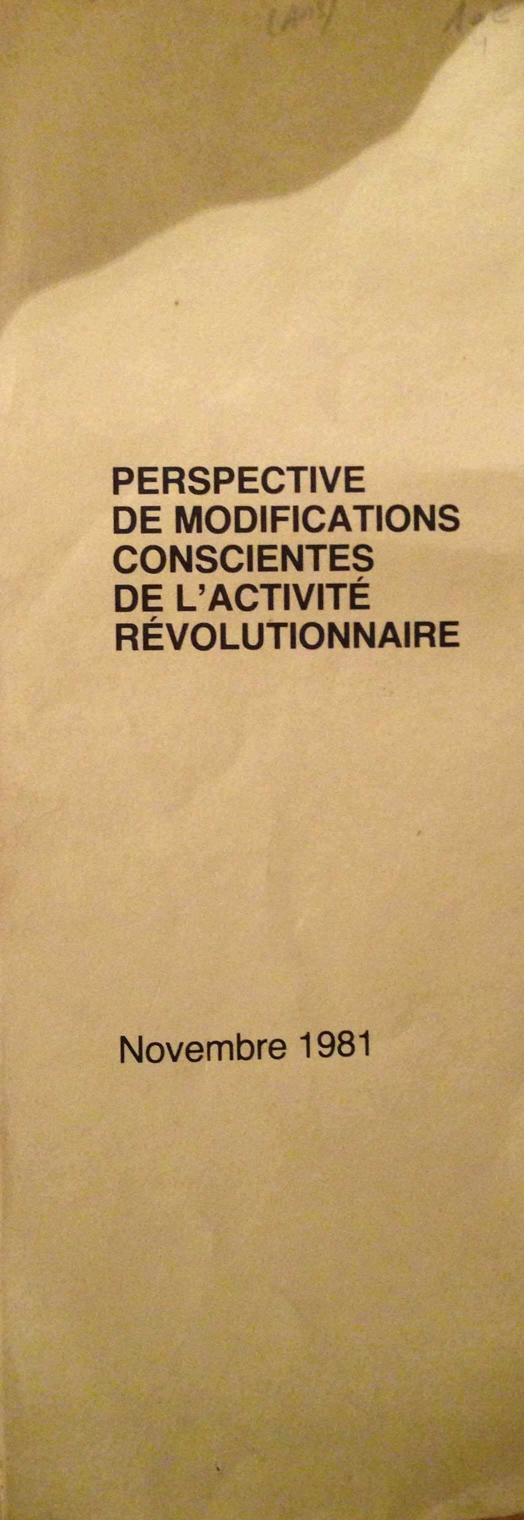 Boulard, Raoul. Perspective de Modifications Conscientes de l’Activite Revolutionnaire. Paris: Le Jargon Libre, November 1981. 1 folded sheet ([6] p.) ; 30 x 66 cm; yellow stock with text in black