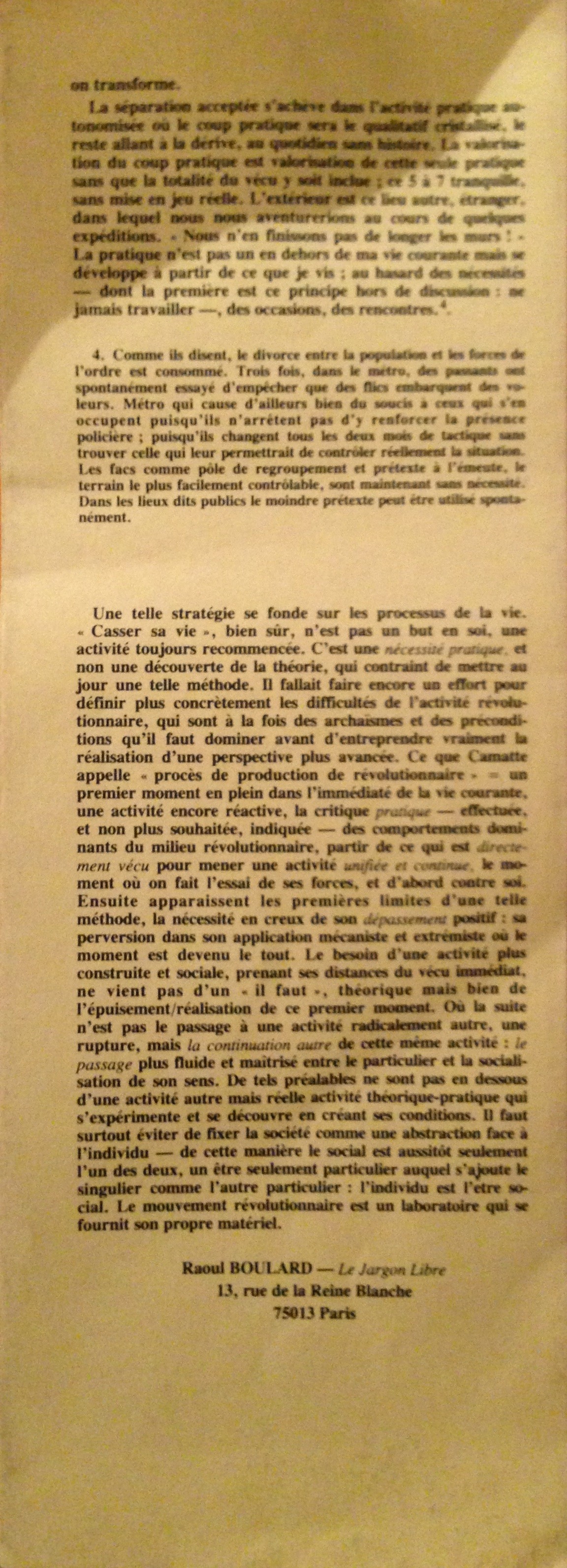 For a long time, the author of this little-known pamphlet remained a mystery- even to Situationist scholars (see Gonzalvez 183). Indeed, the text “was only signed with the word Incontrôlé (“Uncontrolled”), didn’t bear the name of any publisher, and was printed on stolen paper.” Nearly 30 years later, the mystery was lifted when the text was reissued by Editions Lutanie – a small publishing house named after the pamphlet’s author, Jean-Claude Lutanie – in 2011. The 300 copies quickly sold out.
