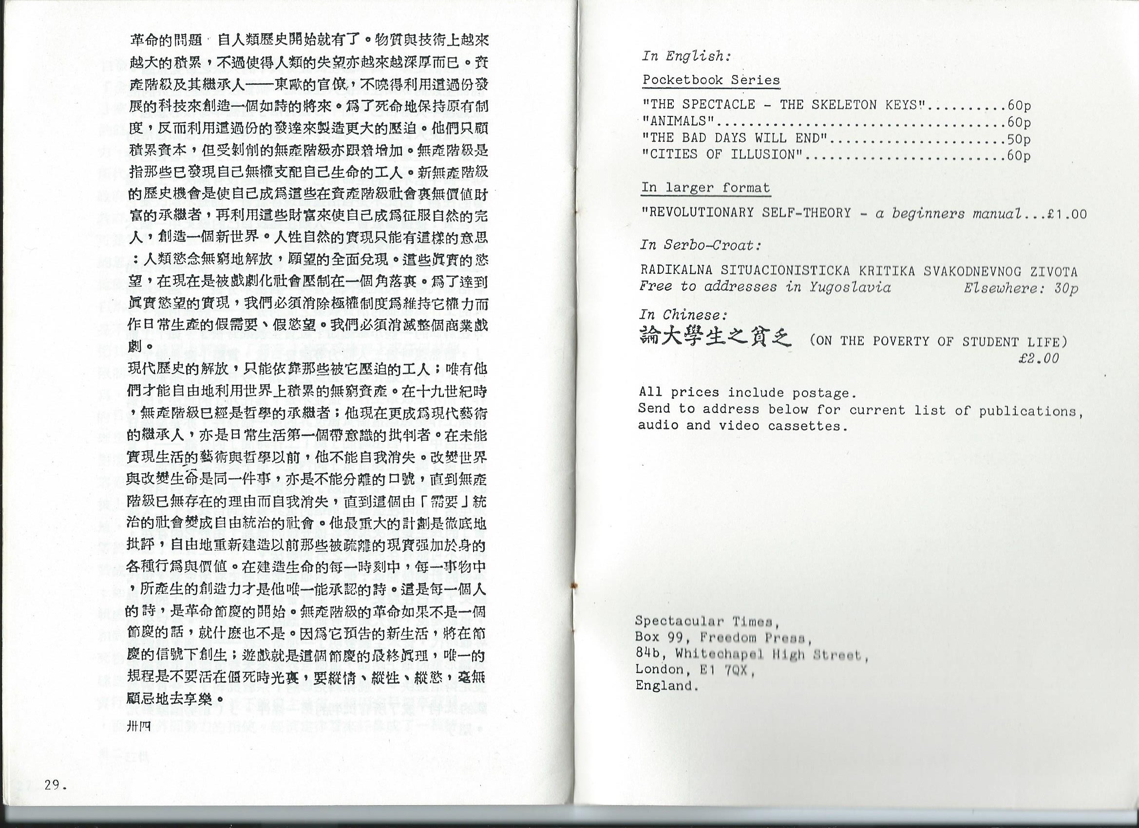 A corrected version of the 1972 translation by Editions Champ Libre (Bibliotheque Asiatique), which was also the first edition in Chinese. Translation and preface by Lu Zhishen. Cover design and correctins by Hei Xing. On the last page, advertisement for Spectacular Times publications and P.O. Box address of Spectacular Times (Box 99, Freedom Press, 84b, Whitechapel High Street, London, E1 7QX, England)